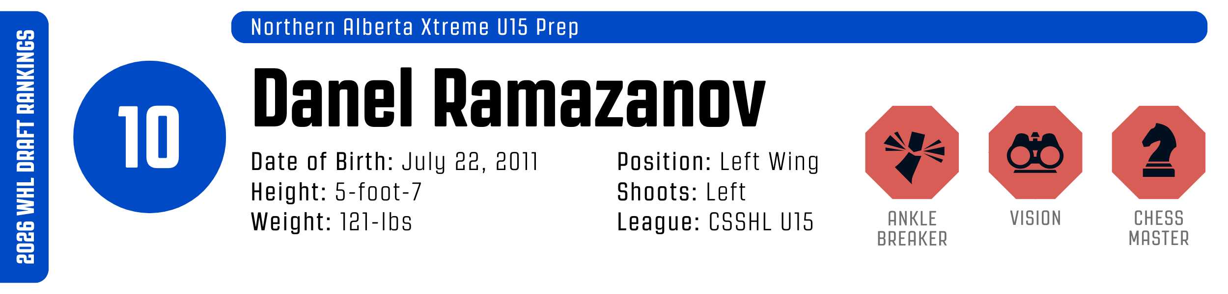 While his size remains the primary question mark, Ramazanov has begun to silence critics with a surprisingly gritty physical layer. He has shown a knack for well-timed reverse hits and a willingness to crash the crease against much older competition at the U18 level. If he continues to refine his directness off the rush, his high-end skill and relentless pace should see him become one of the league’s most dangerous and creative play-drivers.