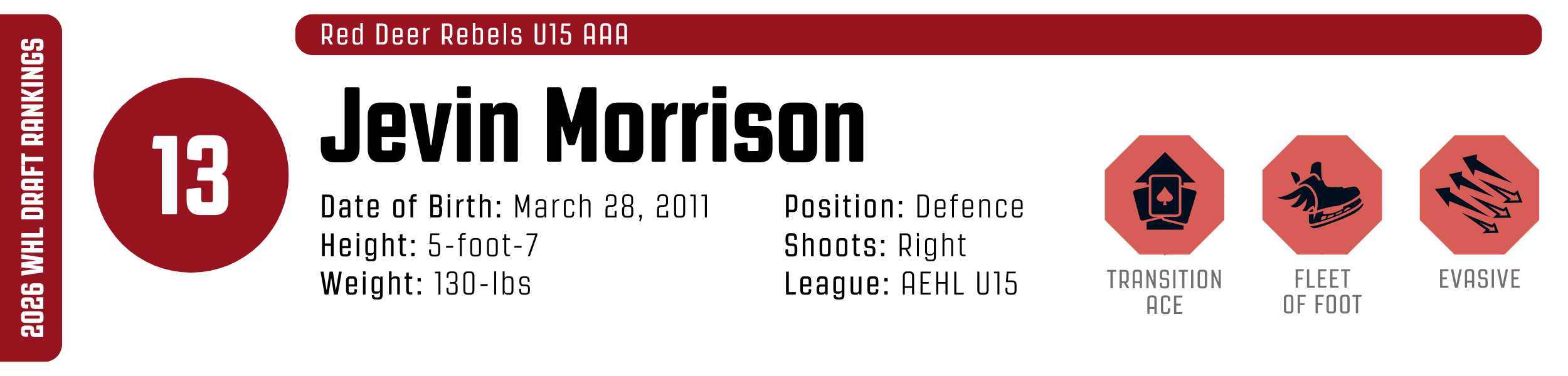 Jett Evans is a big-game hunter who thrives when the lights are brightest. An explosive, high-motor centre, he dictates play through a combination of elite lateral agility and relentless puck pursuit. Evans is a master of the east-west attack, utilizing slick toe-drags and deceptive saucer passes to dismantle defensive structures. His game is defined by its completeness; he is as reliable defending a one-goal lead as he is driving the net for a clutch equalizer. With top-notch puck protection habits and a knack for timely, hero goals, Evans projects as a versatile centre who elevates his game when the stakes are highest.