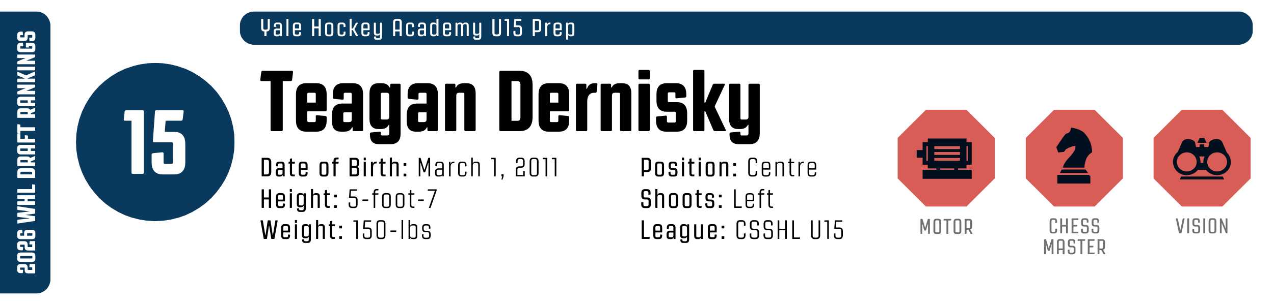 Teagan Dernisky is a master facilitator whose historic point production is a byproduct of elite foresight and a motor that never quits. He’s a high-IQ connective pivot who excels at navigating the neutral zone and identifying passing lanes before they fully develop. He's remarkably slippery along the boards, using craftiness and hip-pocket protection to escape defenders twice his size. Whether he’s winning end-board retrievals, killing penalties with aggressive foresight, or threading a primary assist on an overtime winner, his impact is felt in every phase of the game. He maintains a high work rate across every shift, using his agility to slip around contact and funnel pucks toward high-danger areas of the ice. He projects well as a top-six WHL forward, especially if he grows a bit more.