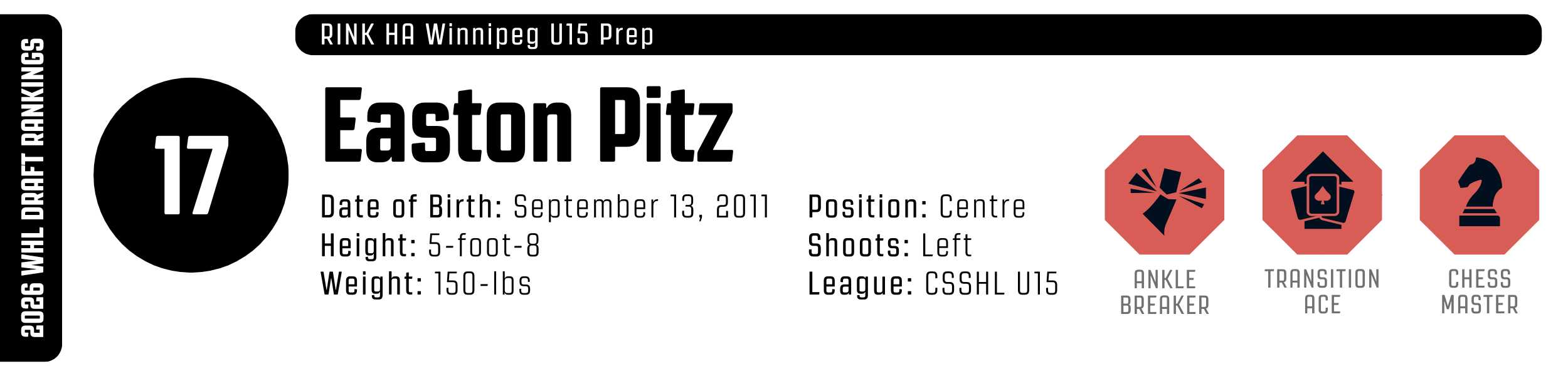 The undisputed centre of gravity for RINK Winnipeg, Easton Pitz, is a dynamic attacker who dictates the pace and physicality of every shift. An offensive engine, Pitz combines elite hands in motion with a fearless approach that consistently lands him in the middle of the ice. Whether he’s drop-stepping a defender with an explosive east-west cut or wiring a snapper while falling, his ability to generate momentum is elite. He relishes board battles and possesses a heavy shot with pro-level drag mechanics. While he needs to add strength to support his power-move posture, his competitive motor and high-end processing should see him become a reliable scoring centre in the WHL.