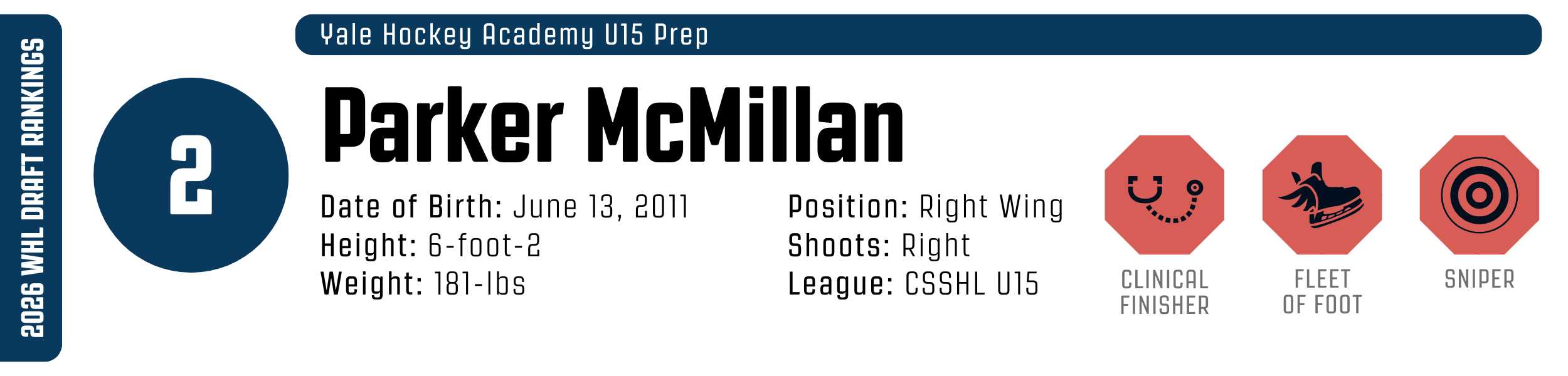A tall, explosive winger, McMillan is a cheat code at the under-15 level. His 6-foot-2 frame, contact game, and protection details are already beyond his years. Hip-pocket holds, inside-lane hunting, and proactive physicality all blend with ridiculous lower-body power, making McMillan a unique quantity in this draft.