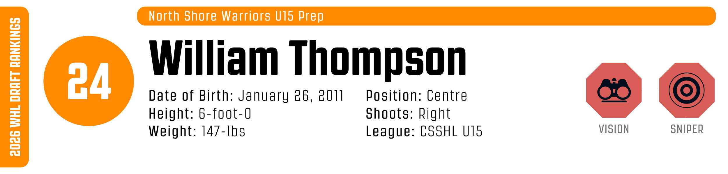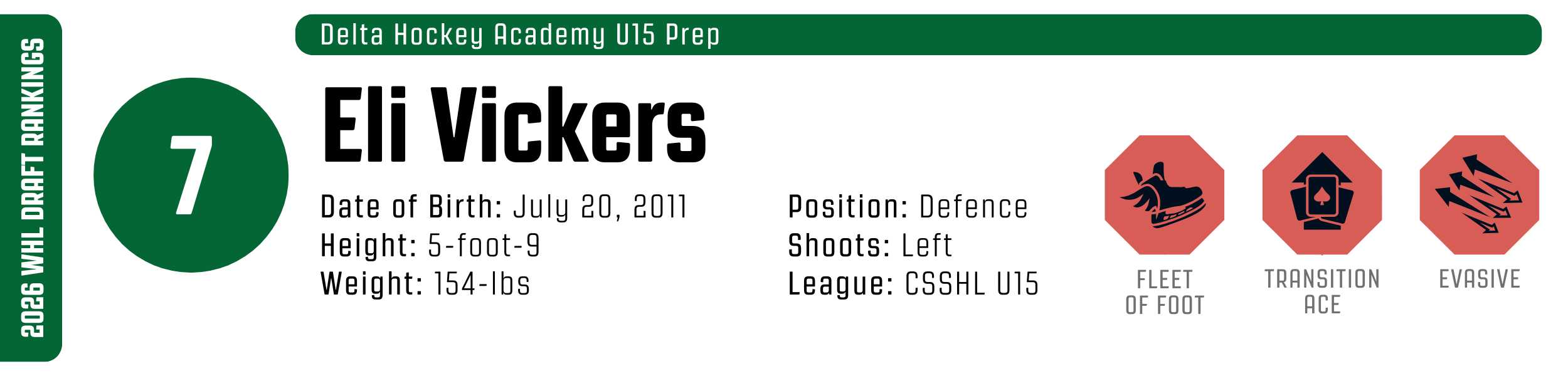 Vickers is undersized, but there is still considerable physical runway available across his profile. He will have to rely more on his processing and skating to get stops over his punishing physicality. He projects as a potential No. 1 WHL defenceman – a point-producing play-driver.