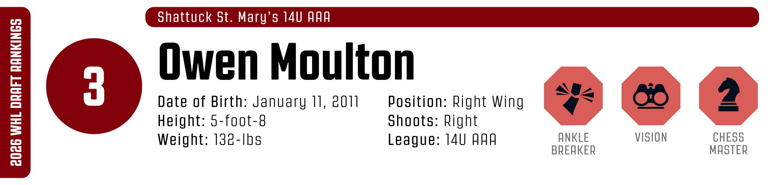 Beyond the skill, Moulton plays with a pro-style jam that makes his game remarkably translatable. He is an interior-driven force who relishes physical engagement, frequently finishing checks and outworking larger defenders to claim high-danger ice. While his slight frame may be a factor early on, his combination of pace, high-end skill, and relentless compete should see him become a league game-breaker, provided he chooses the WHL route.