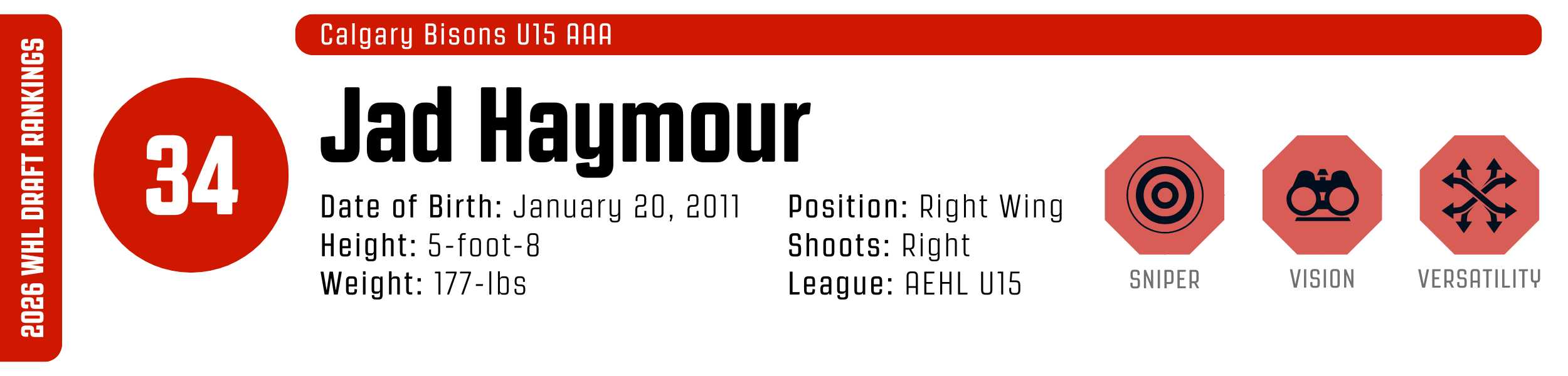 A true dual-threat creator, Jad Haymour is a sniper, net-front finisher, short-range passer, and deceptive playmaker all in one. He’s constantly scanning, looking for opportunities to use the trailer, weak side, or middle-lane driver. If there’s space, he uses every inch before advancing the puck, bringing a rare level of puck management for this age. Effective in battles with his strength and low centre of gravity, he brings puck-winning skills, too. The key for Haymour will be continuing to develop footspeed and pace. If he can do that, he could become an impactful top-nine scorer in the WHL.