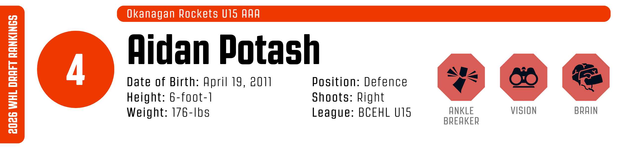 There may not be a defender in this draft with the upside of Aidan Potash. Already standing at 6-foot-1, Potash is the standout game-changer of the BCEHL U15 league, constantly tilting the ice into his team's favour.