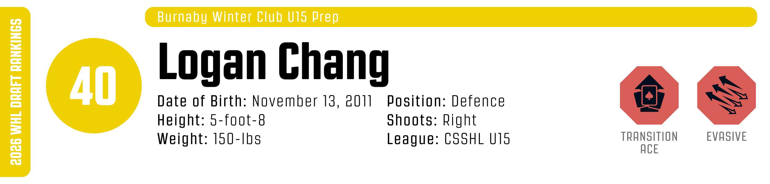 Logan Chang is a fluid, offensive defenceman who serves as the dynamic heartbeat of the Burnaby blueline. A premier powerplay quarterback, Chang weaponizes elite edge-work and constant scanning to weave through neutral-zone traffic and dismantle defensive structures. He’s a frequent activator who loves to fly up the wing, carrying possession end-to-end with a poise that keeps opponents on their heels. While currently a bit undersized, he defends with high-level stick positioning and surprising grit, even mixing in well-timed reverse hits to neutralize larger forecheckers. His ability to manipulate lanes and rip top-shelf snap shots makes him a legitimate dual-threat orchestrator with significant WHL upside.