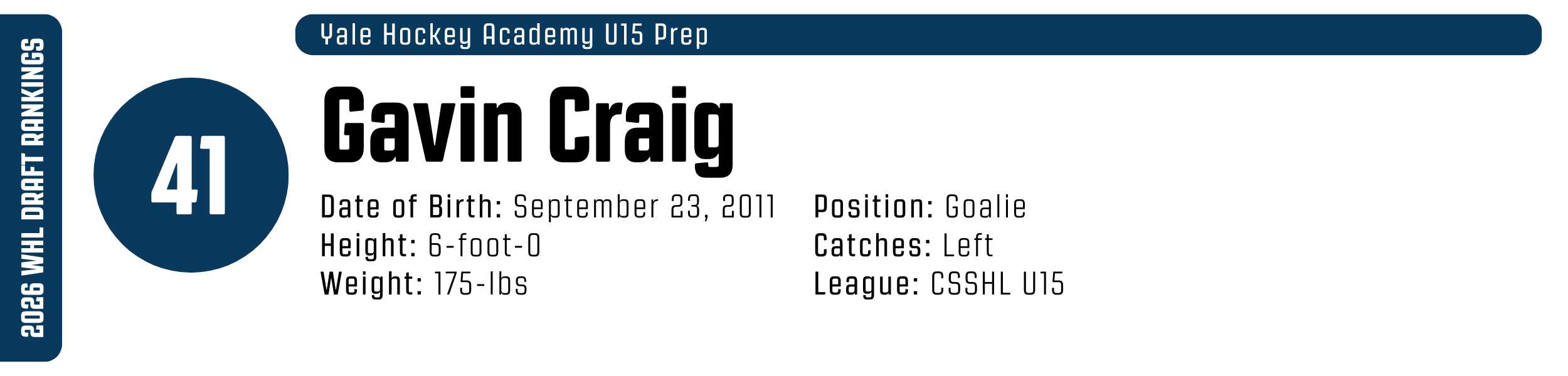 After being just one of 19 full-time CSSHL U15 Prep goalies at 13, Gavin Craig has reached new heights at 14, currently posting the fourth-best save percentage in history with a .943. Plus, he’s already set the all-time shutouts record with seven over his two seasons. Already having WHL-calibre footspeed, he transitions quickly and with control. But it’s really the technique that sets him apart, with tight post integration and a strong stance. Staying more disciplined in his technique and skating form could make him a WHL starter.