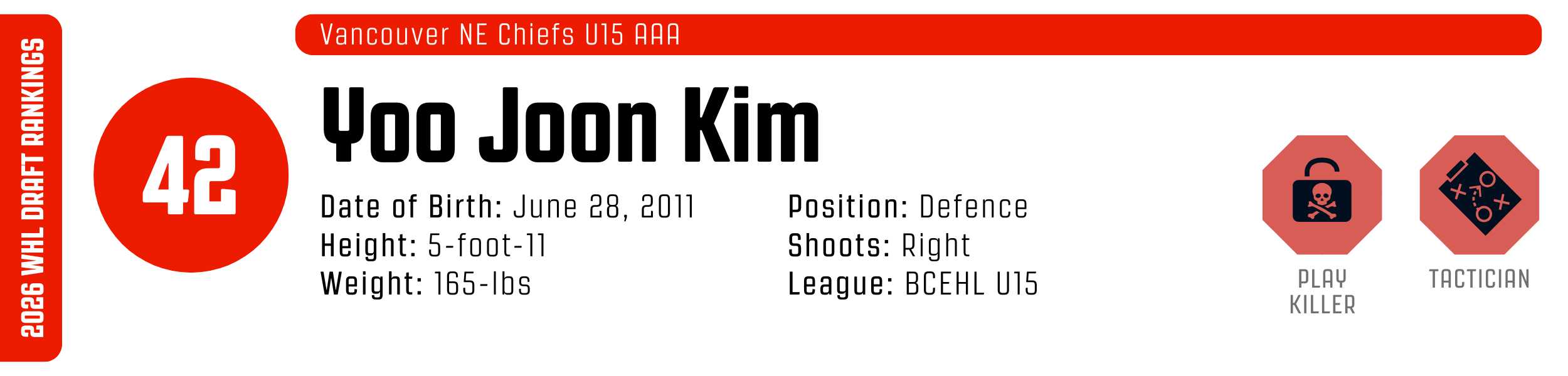 Yoo Joon Kim is a high-IQ, transition defenceman who excels at stifling opposition attacks before they gain momentum. He uses a rangy reach and sophisticated angling to disrupt lanes in the neutral zone, effectively stripping pucks and turning play in the right direction. Kim is an exceptionally poised puck-handler, capable of settling awkward passes under pressure and identifying high-value lanes from the offensive blueline. While he’s a mobile, balanced skater who can carry the puck with confidence, his primary strength lies in his defensive reads and willingness to engage physically. He frequently dictates the terms of engagement along the wall, using well-timed reverse hits and a heavy stick to clear his zone and maintain possession for his team.