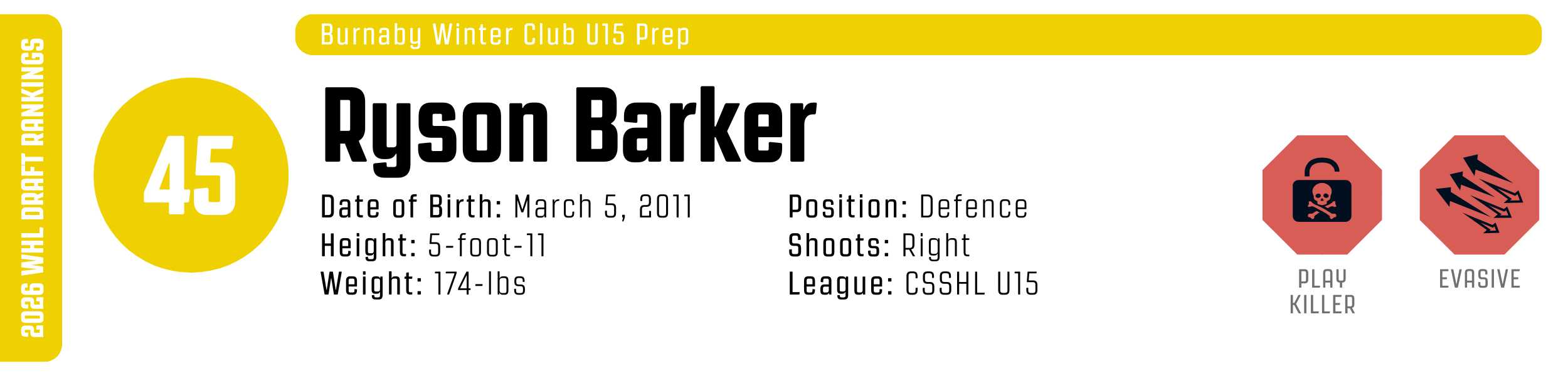 The quintessential modern shutdown defender, Ryson Barker, combines elite edge work with a punishing physical edge. Barker excels at using his lateral mobility to squeeze attackers out of the play and kill rushes before they reach the defensive blueline. He plays with grit, consistently bullying forwards in the corners and landing massive, clean open-ice hits. While his defensive identity is clear, Barker is also an adept puck-mover; he shows immense poise under pressure, shaking forecheckers with sharp cutbacks and landing precise saucer passes to spring the counterattack. Reliable and mobile, he projects as a shutdown defenceman in the WHL.