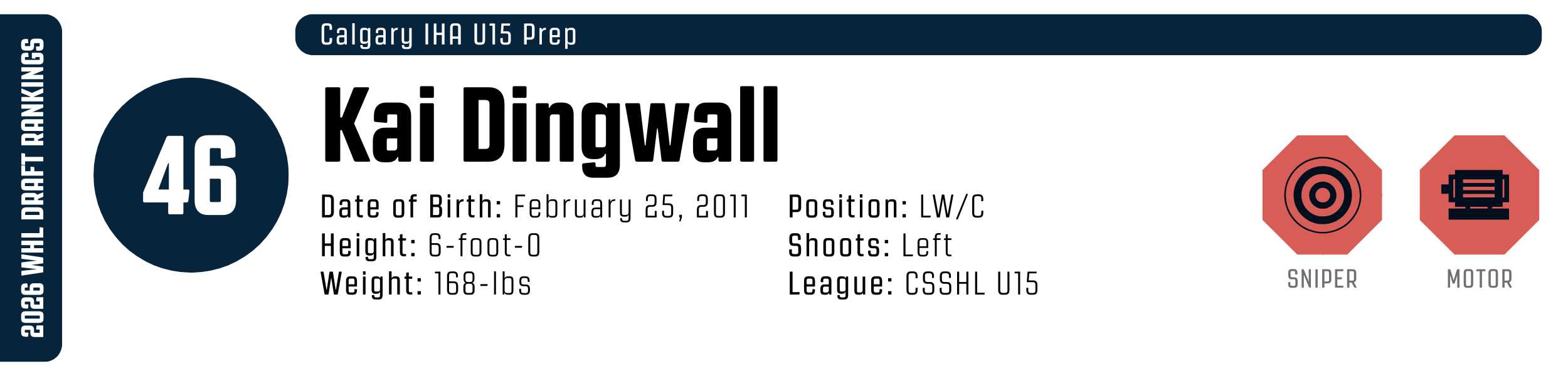 Kai Dingwall is a prototypical power forward who weaponizes his imposing frame and sheer strength to dominate the interior of the ice. A worker with an intense competitive engine, Dingwall thrives on winning puck battles along the wall and driving his shoulder through defenders to claim the slot. His game is defined by high-end puck protection and a heavy, dangerous shot that makes him a perennial scoring threat. While he currently lacks elite explosiveness, his ability to execute high-skill plays under heavy contact is rare for his age. A 200-foot centre with undeniable certainty in his projection, Dingwall projects as a physical force who can provide on the power play and dictate terms physically.