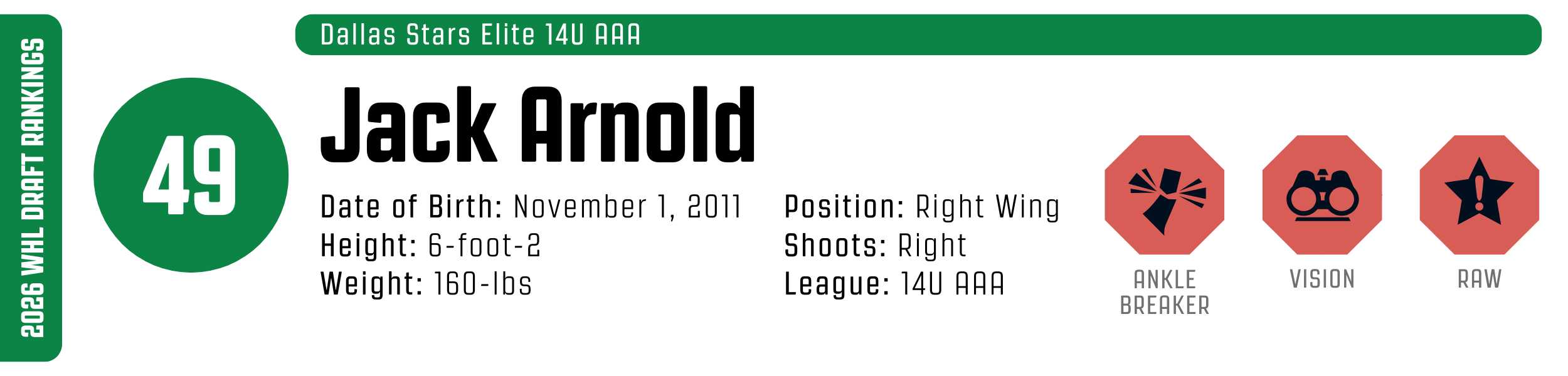 Jack Arnold is a physically imposing winger who weaponizes his massive reach to play a sophisticated power game. He is a high-level offensive processor who sees passing lanes clearly even while under heavy pressure or engaging in wall battles. Arnold excels at using his frame to shield pucks, often turning his back to opponents and leaning into their space to create separation. Whether he’s executing a slick toe-drag to the backhand for a backdoor feed or outskating defenders to find quiet ice for a heavy snap shot, his skill set is remarkably refined for his size. While he’s still developing the coordination and skating depth typical for a player of his stature, his combination of hockey sense, puck protection, and finishing ability gives him immense potential as a modern WHL power winger.