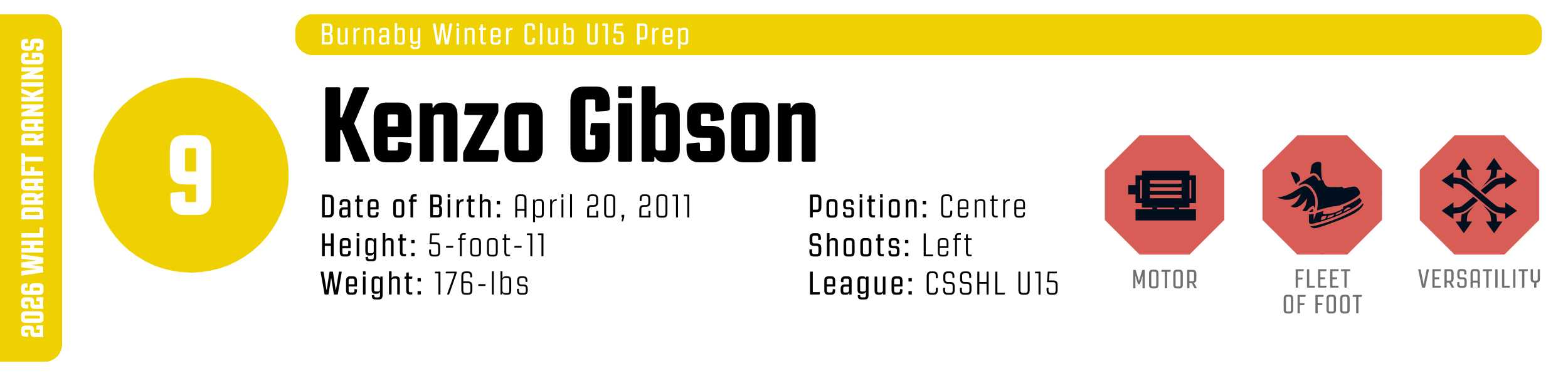 A master of the hip-pocket protected cut, Gibson uses his strength to muscle through contact and claim the middle of the ice. His shot is a legitimate WHL-calibre weapon, characterized by heavy downforce and incredible precision. Whether working off the cycle or utilizing explosive crossovers to build outside speed, he’s a constant threat to tilt the ice.