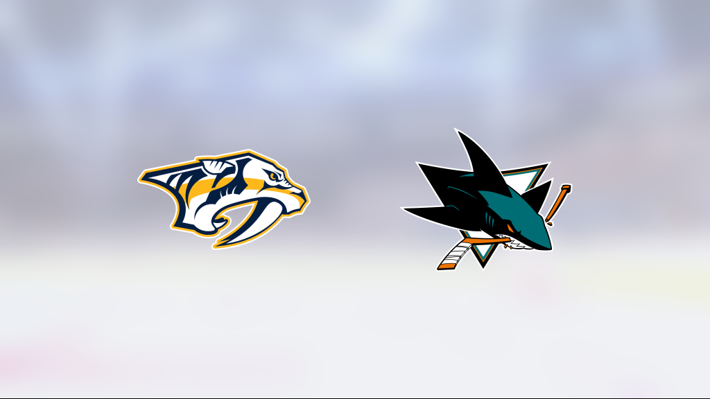 Nashville Predators improves to 42–26–5, while San Jose Sharks drops to 29–33–10.