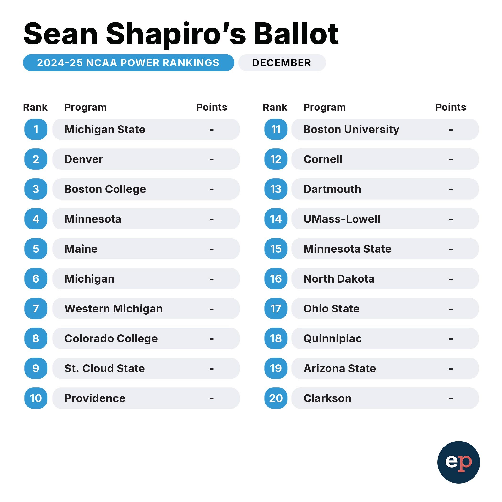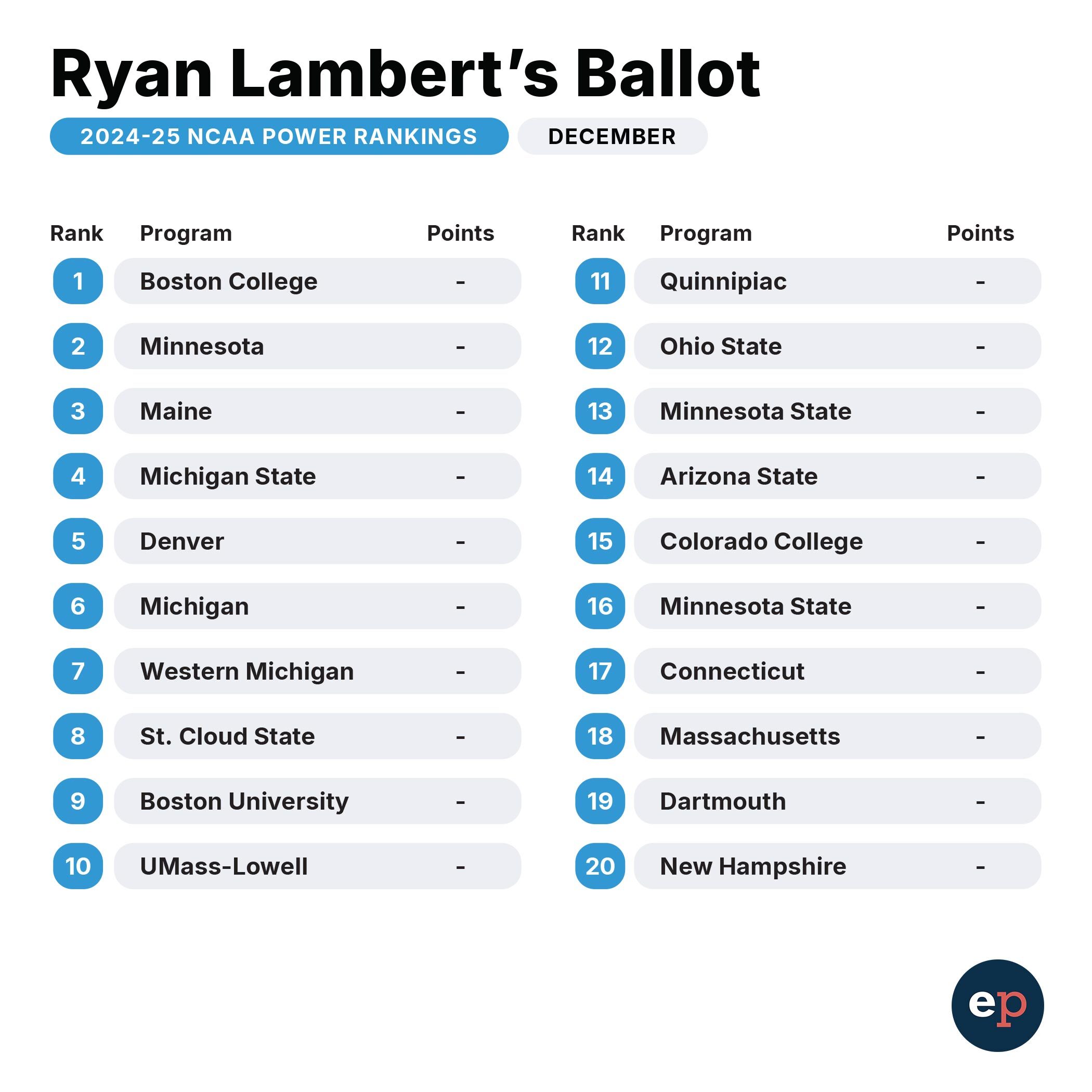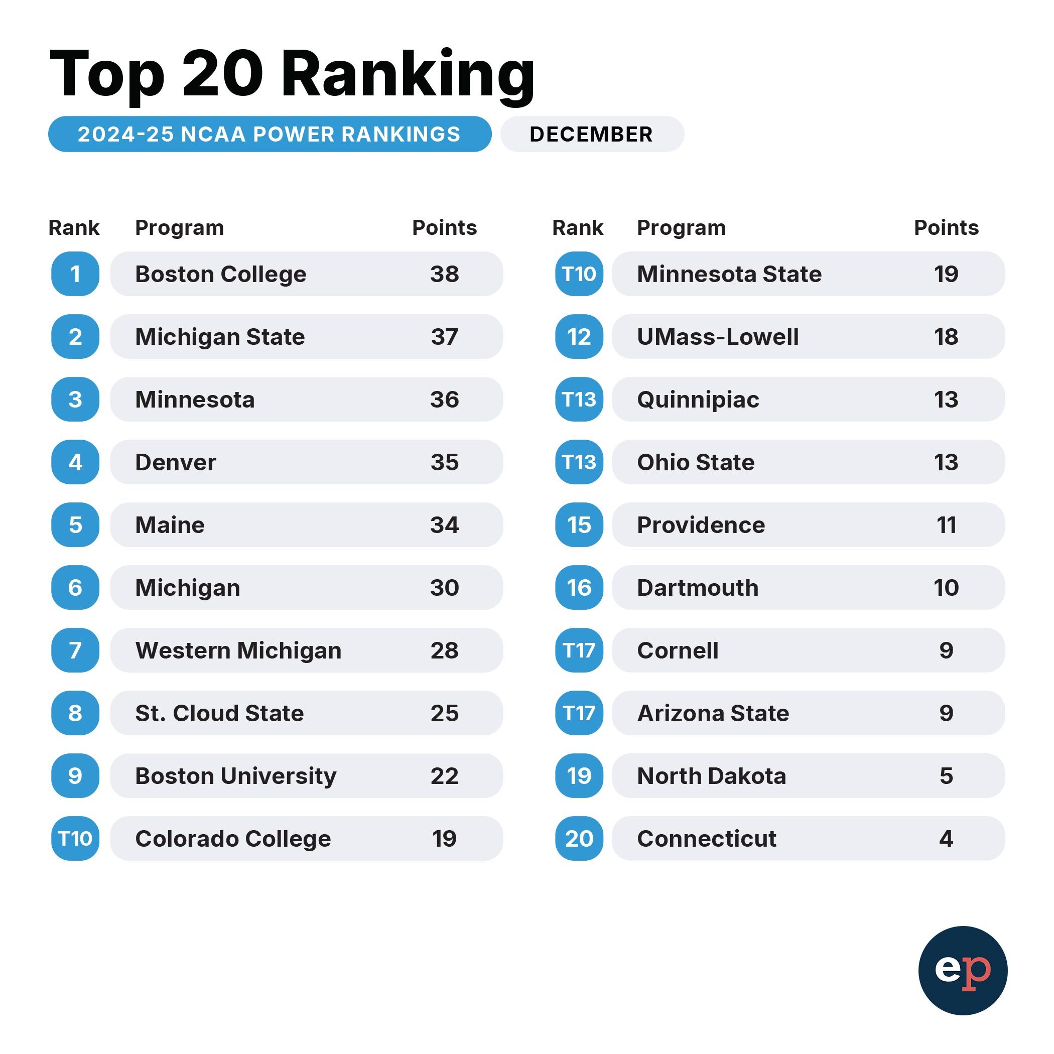 Elite Prospects NCAA Power Rankings for early December