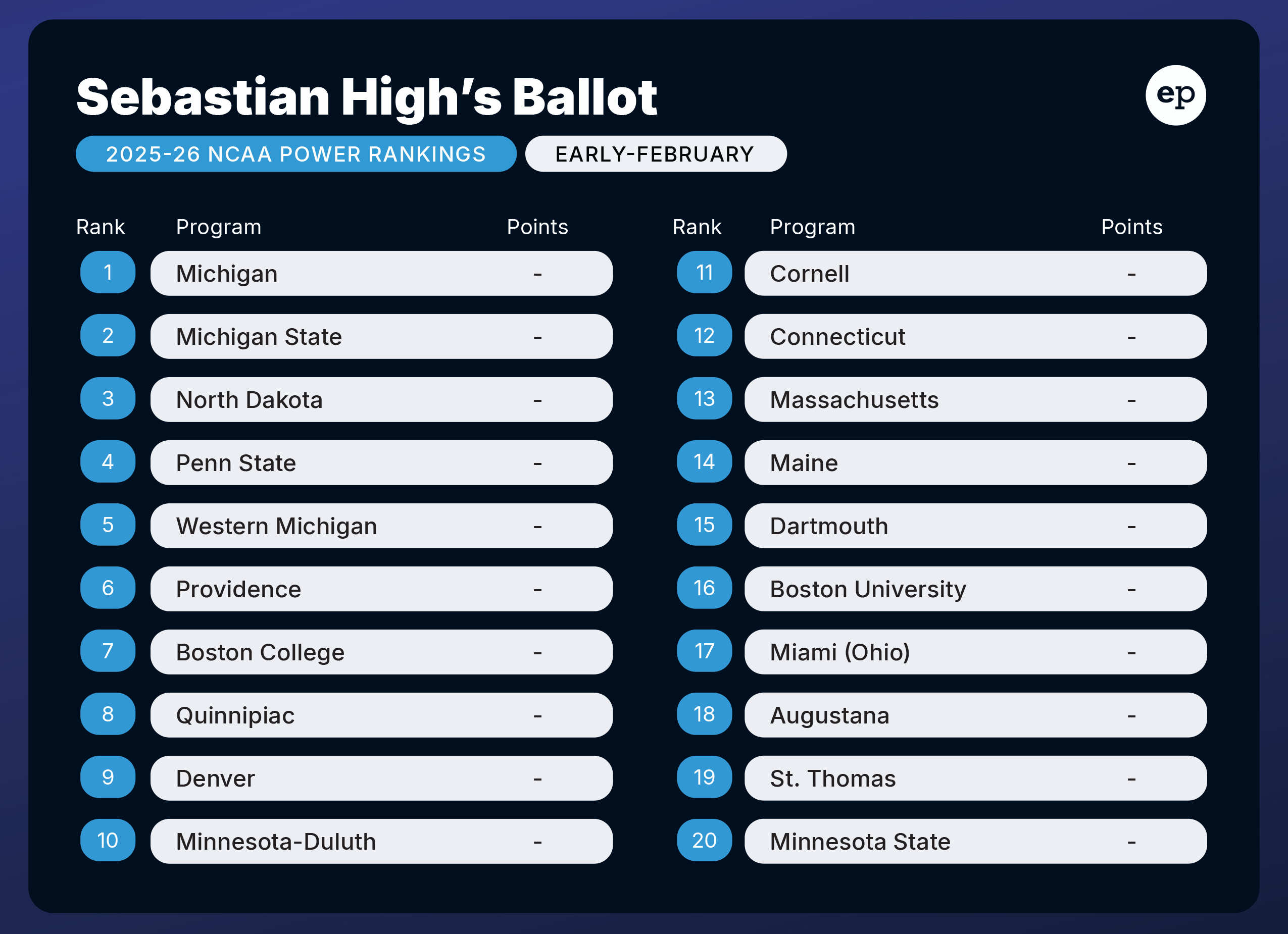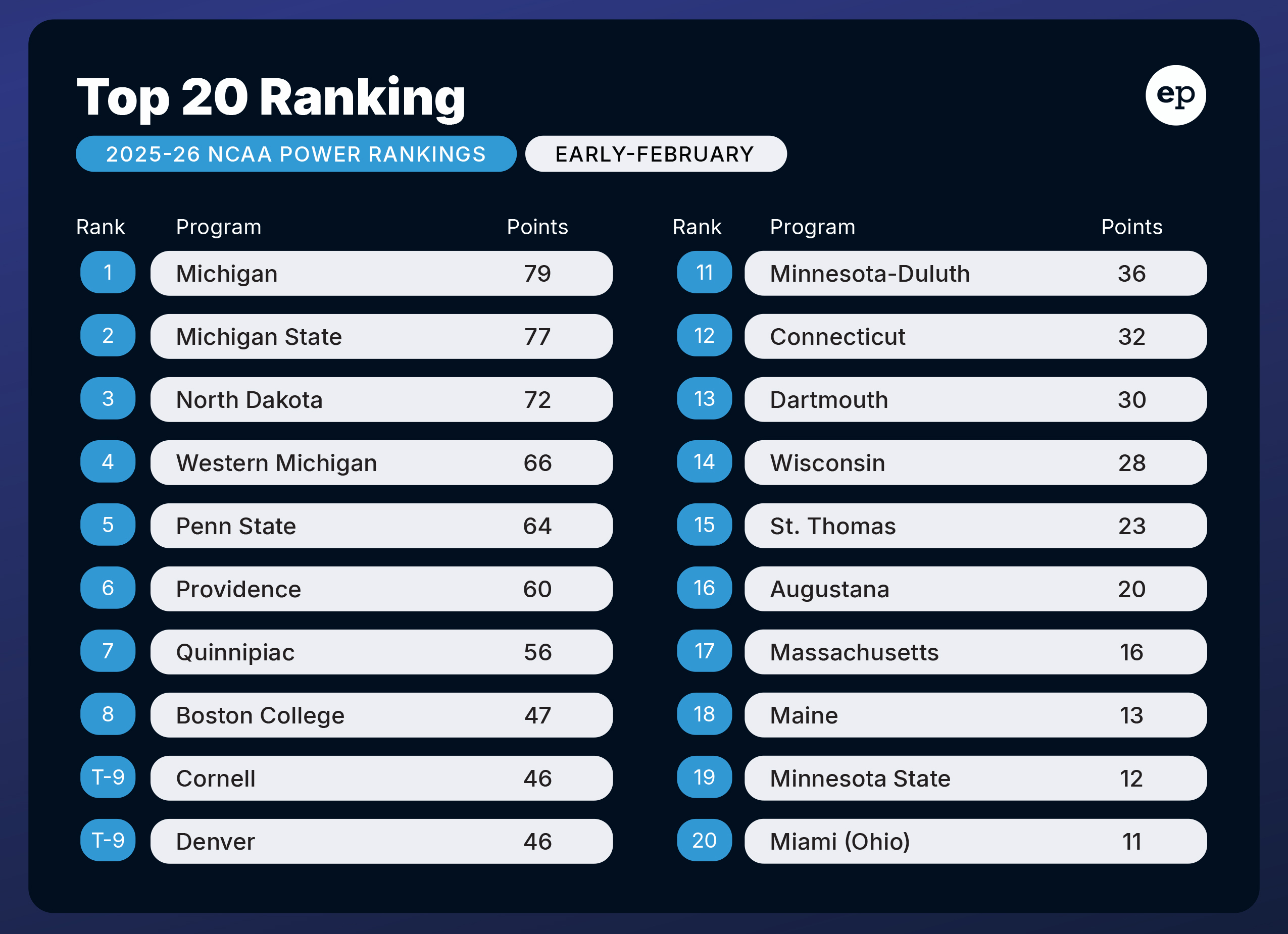 Elite Prospects NCAA Power Rankings for early February