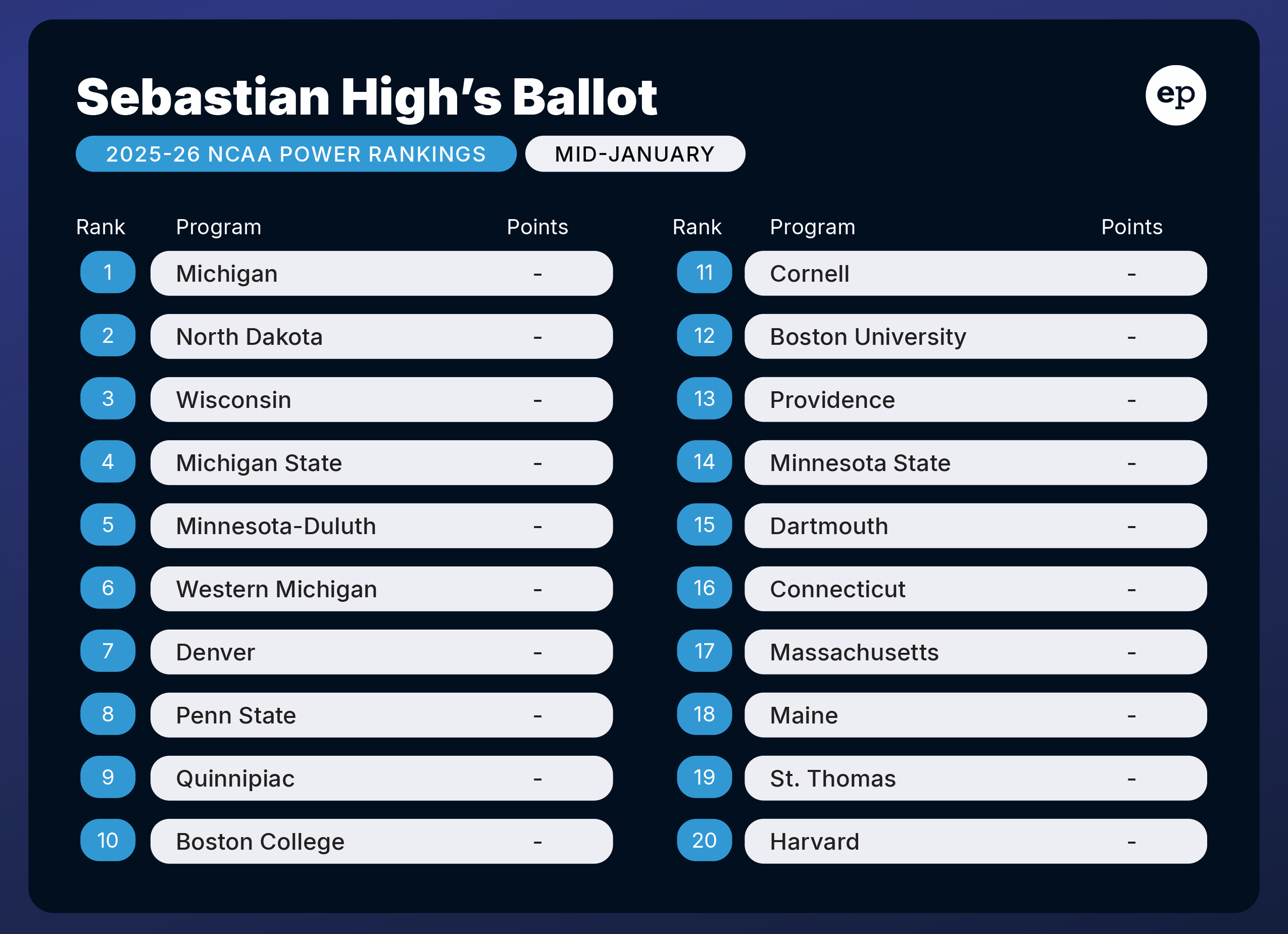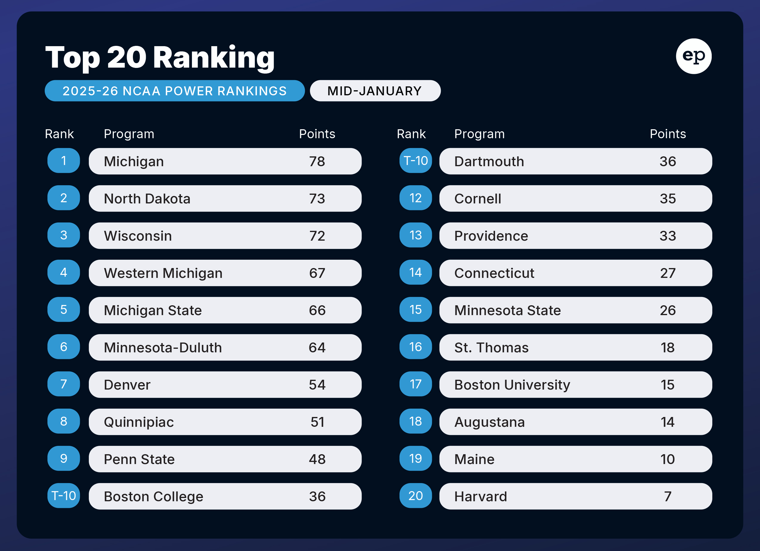 Elite Prospects NCAA Power Rankings for mid-January 2026