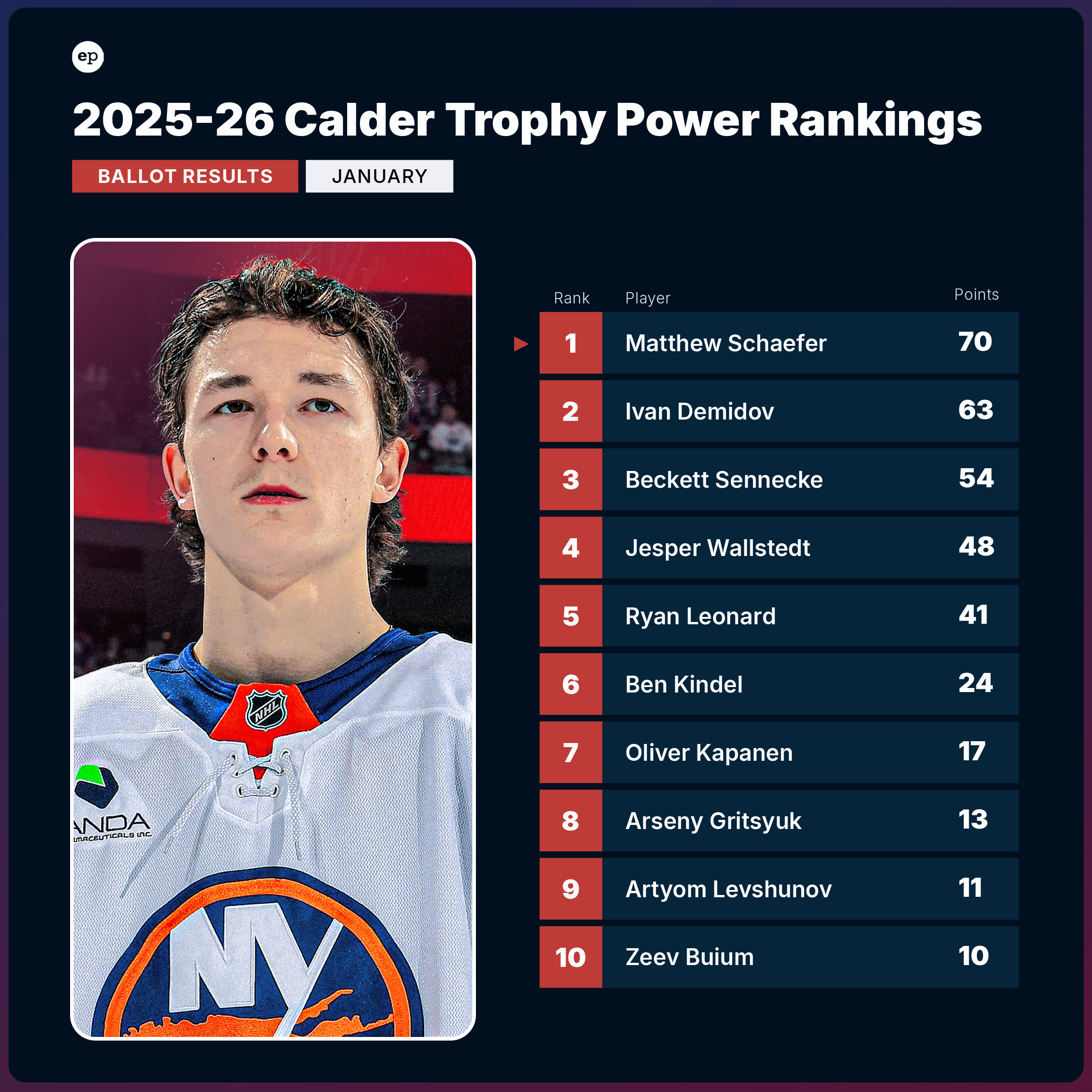 The new year hasn’t changed the names at the very top of the Calder Trophy Power Rankings. As the season passes the midpoint, Matthew Schaefer remains the gold standard among first-year NHL players, driving results at both ends of the ice as the league’s youngest skater. Electric winger Ivan Demidov continues to nip at his heels, while Beckett Sennecke holds down the final spot on the podium.