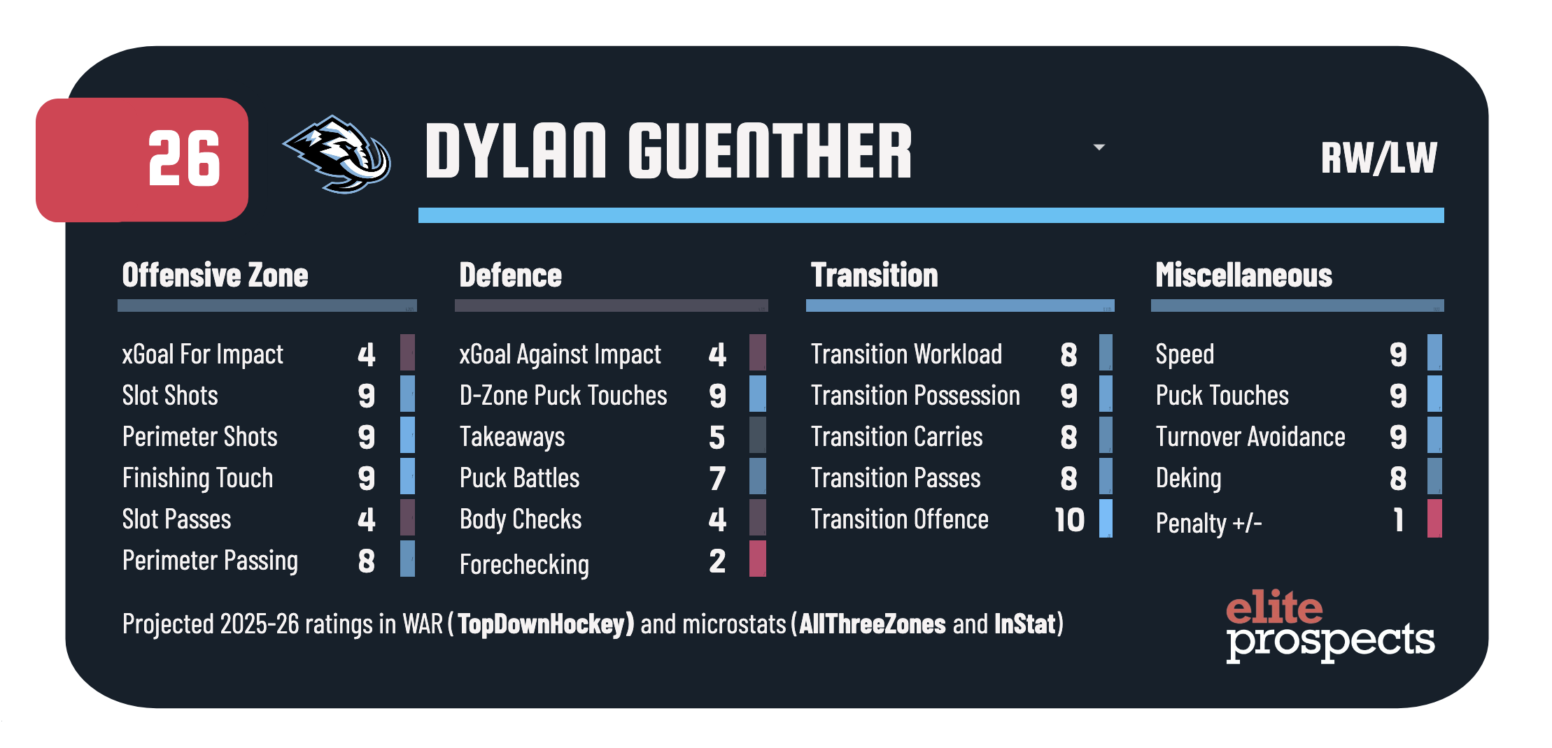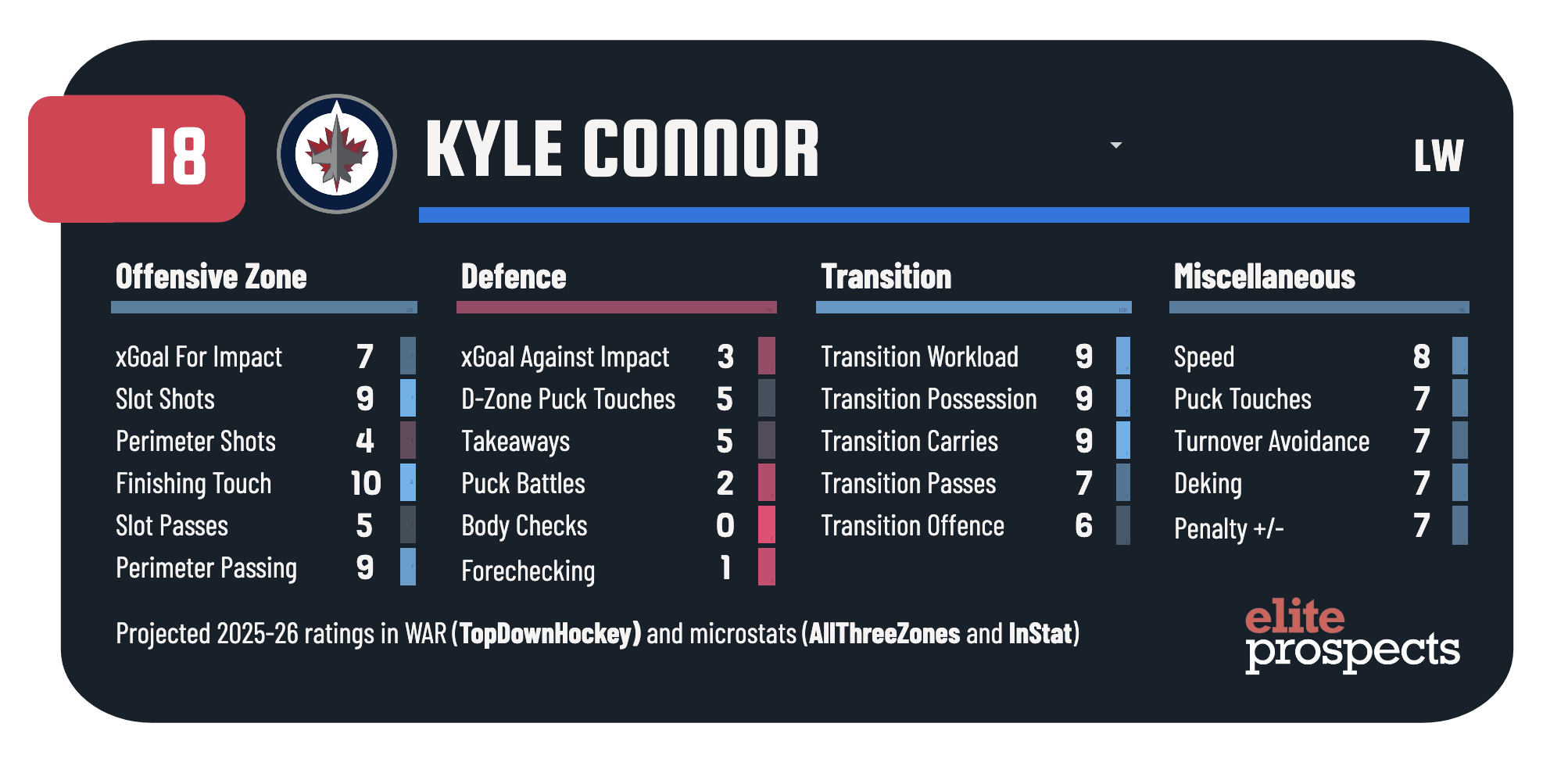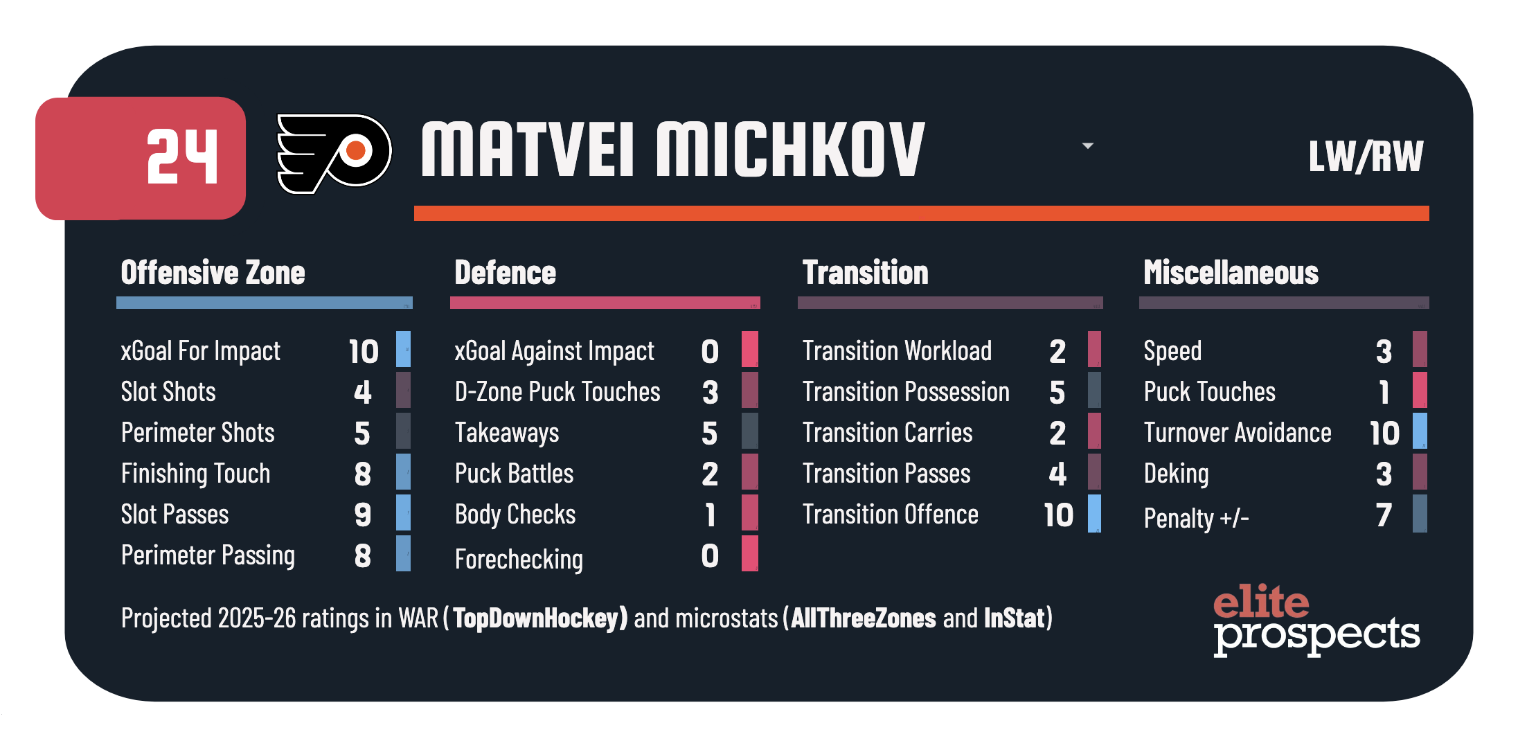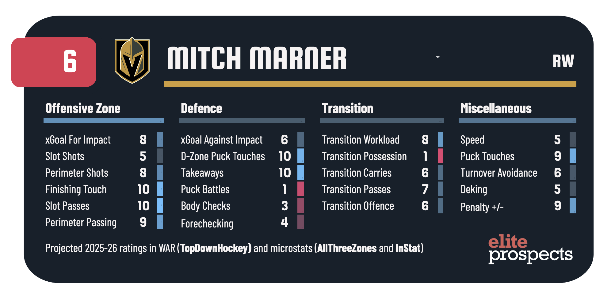 The graphics, inspired by the work done by Elite Prospects' prospect writers, include projected player ratings for the 2024-25 season in four categories: offensive zone play, defence, transition play, and miscellaneous. Departing from the percentile rankings I use on my player cards, here I use a 1-to-10 rating based on projected finish to respect the uncertainty at play here. The idea is to provide a broad impression of every player's strengths and weaknesses and give you as accurate an impression as possible of how they play.