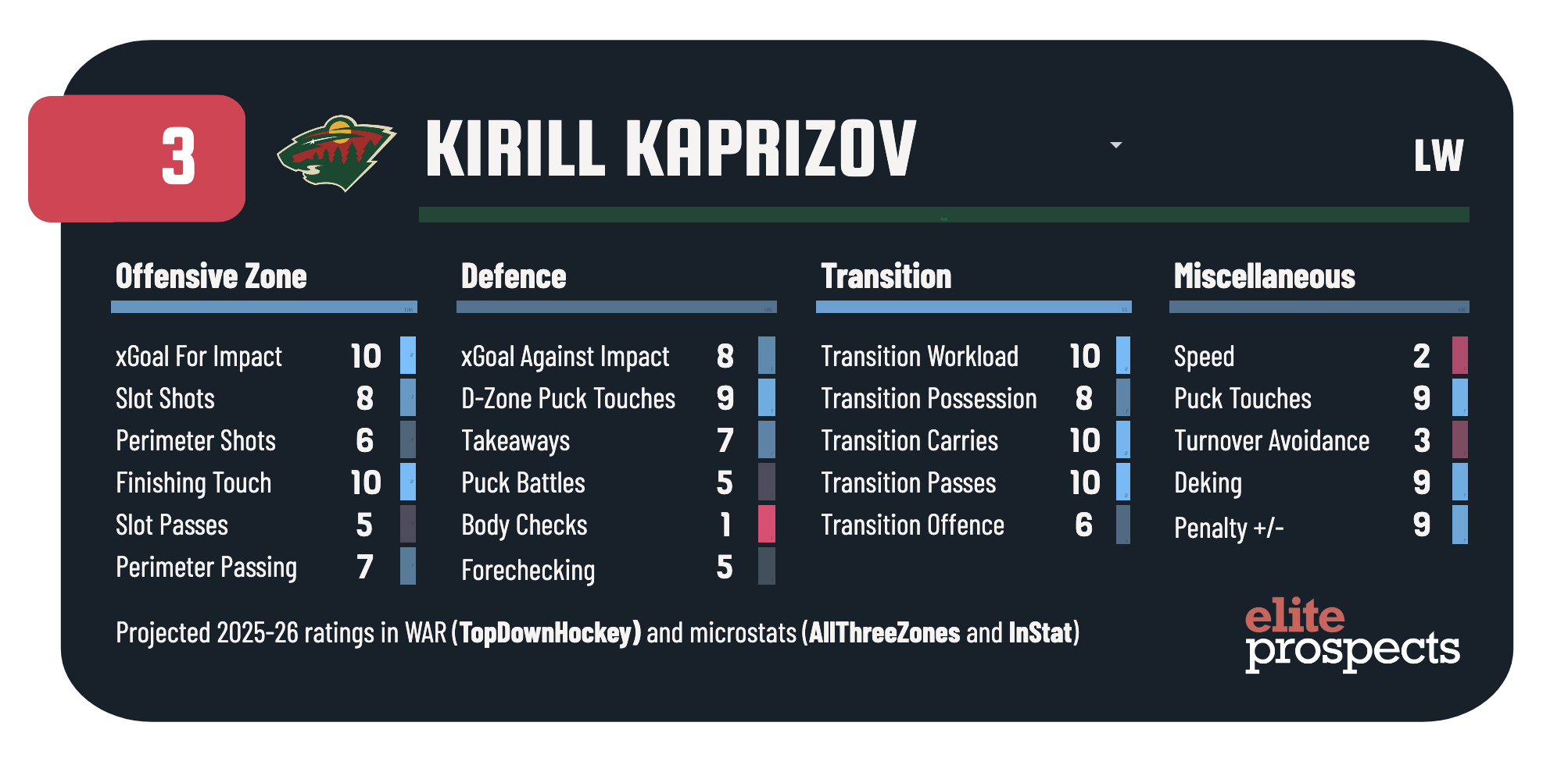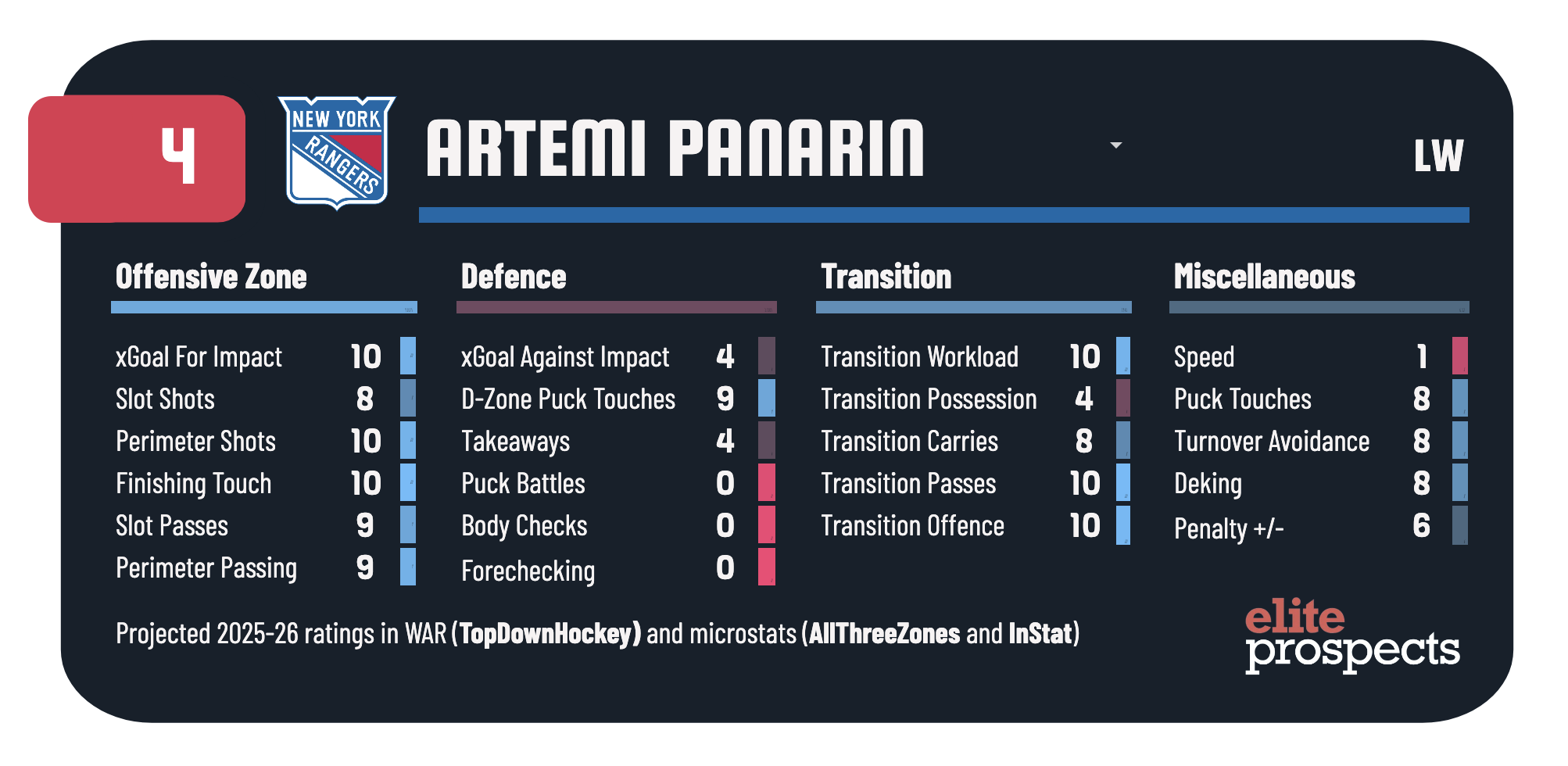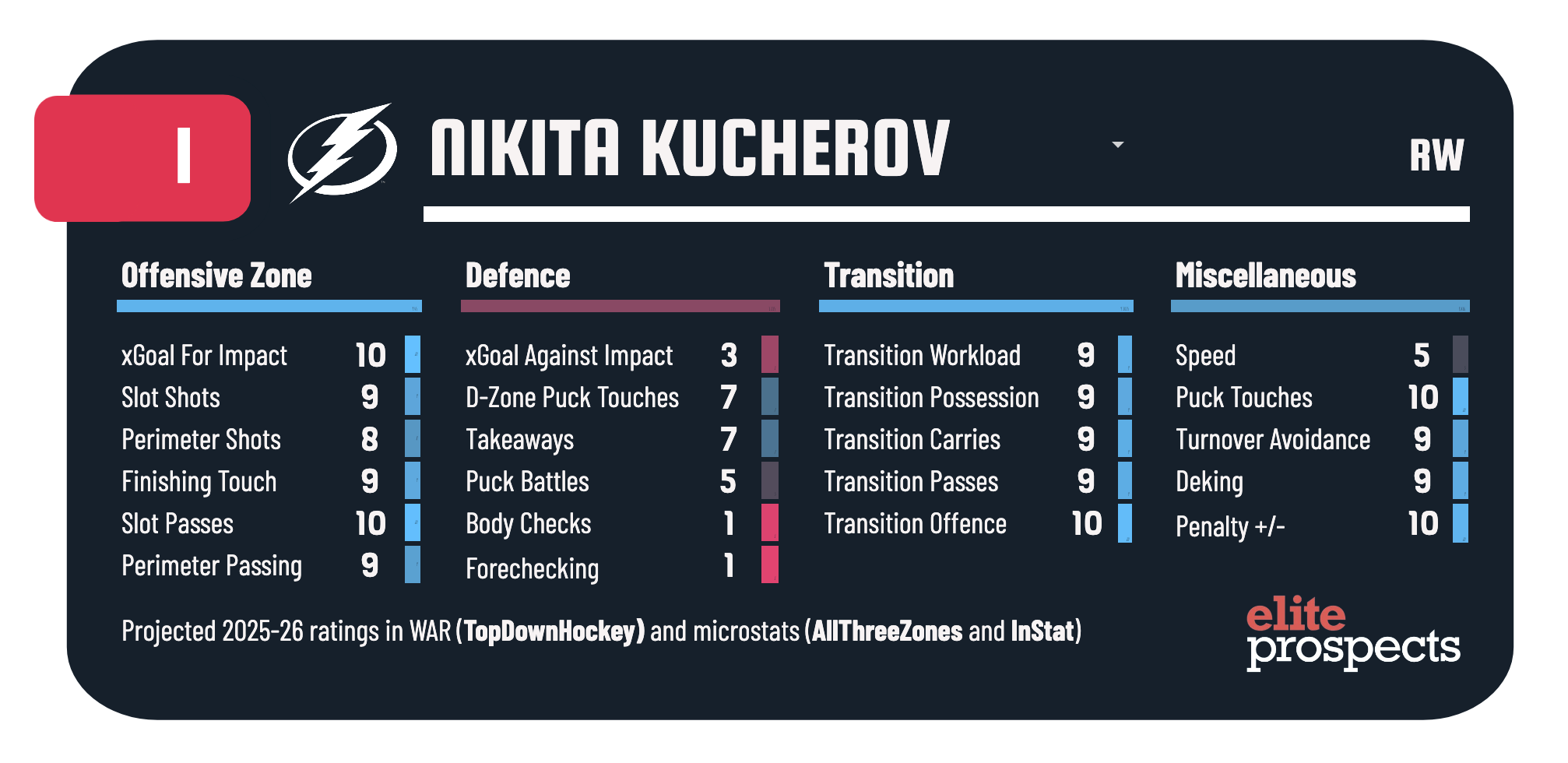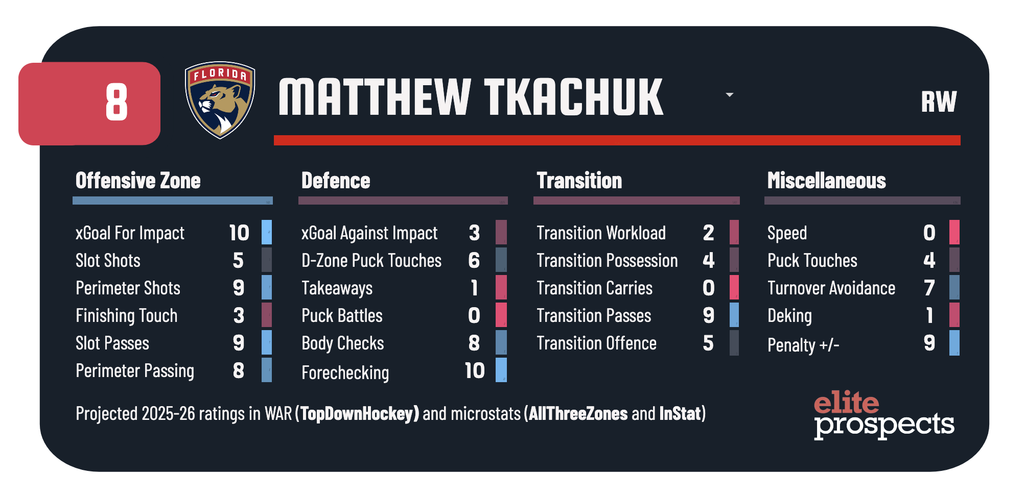 The graphics, inspired by the work done by Elite Prospects' prospect writers, include projected player ratings for the 2024-25 season in four categories: offensive zone play, defence, transition play, and miscellaneous. Departing from the percentile rankings I use on my player cards, here I use a 1-to-10 rating based on projected finish to respect the uncertainty at play here. The idea is to provide a broad impression of every player's strengths and weaknesses and give you as accurate an impression as possible of how they play.