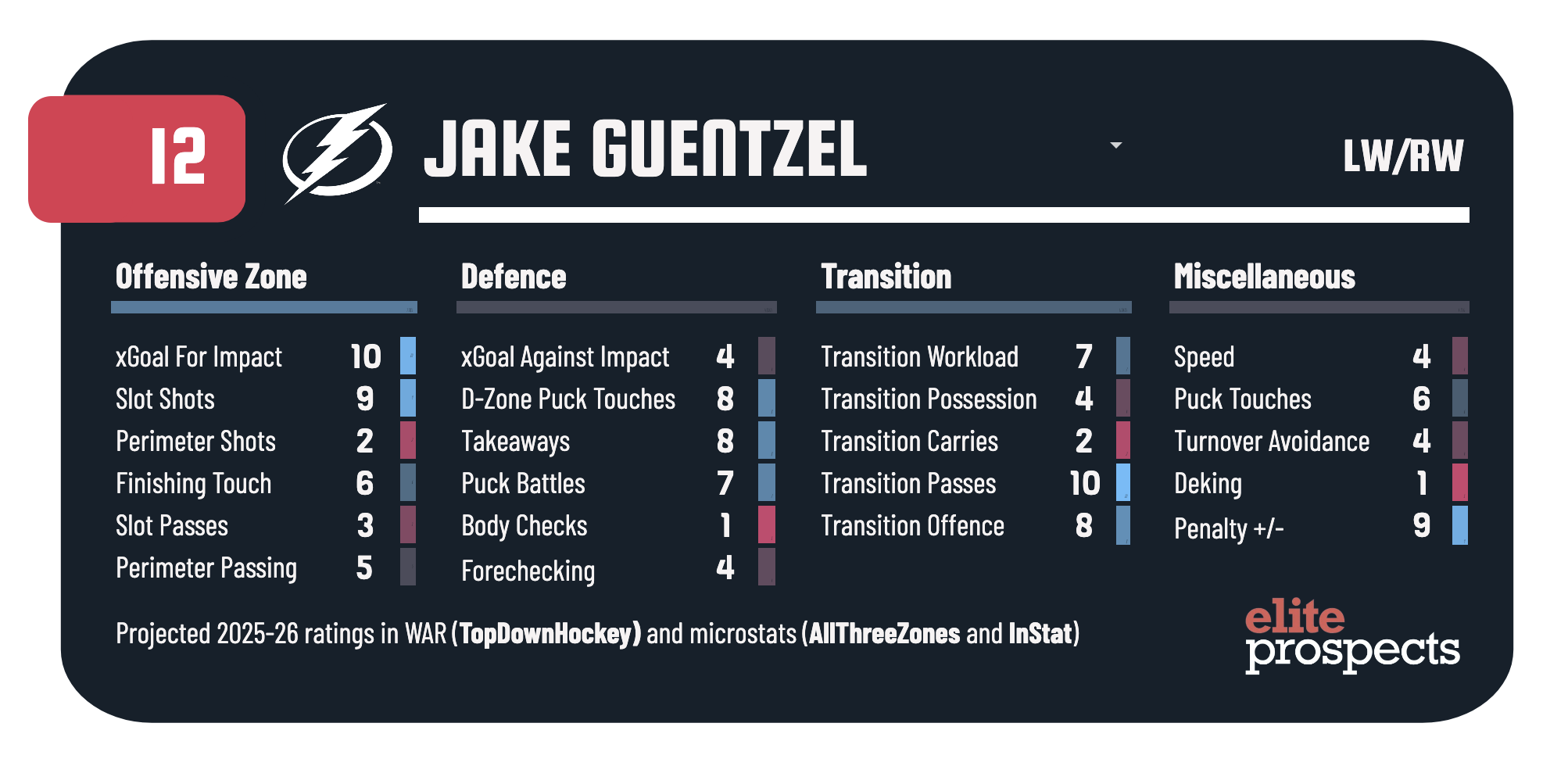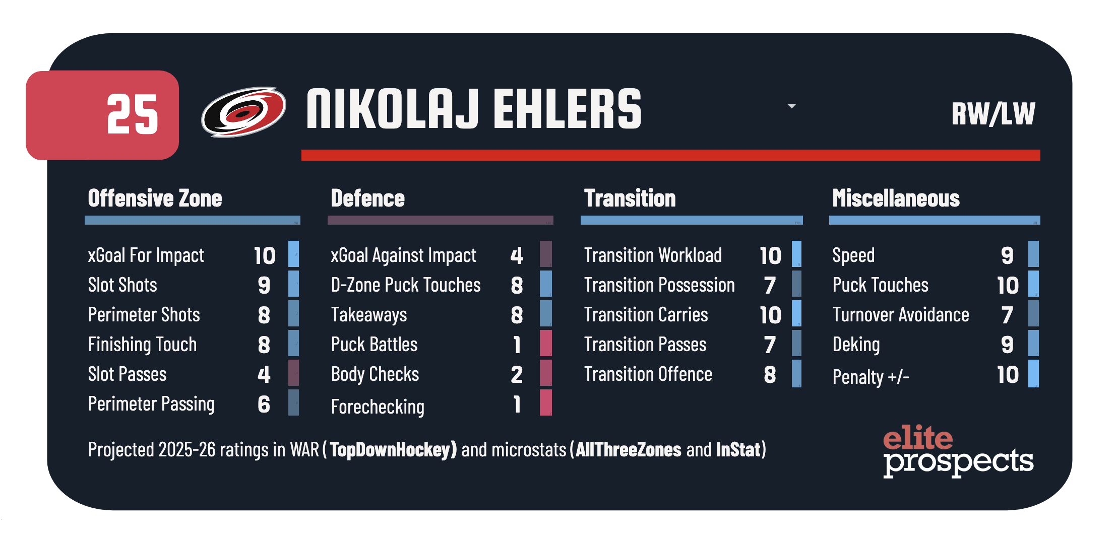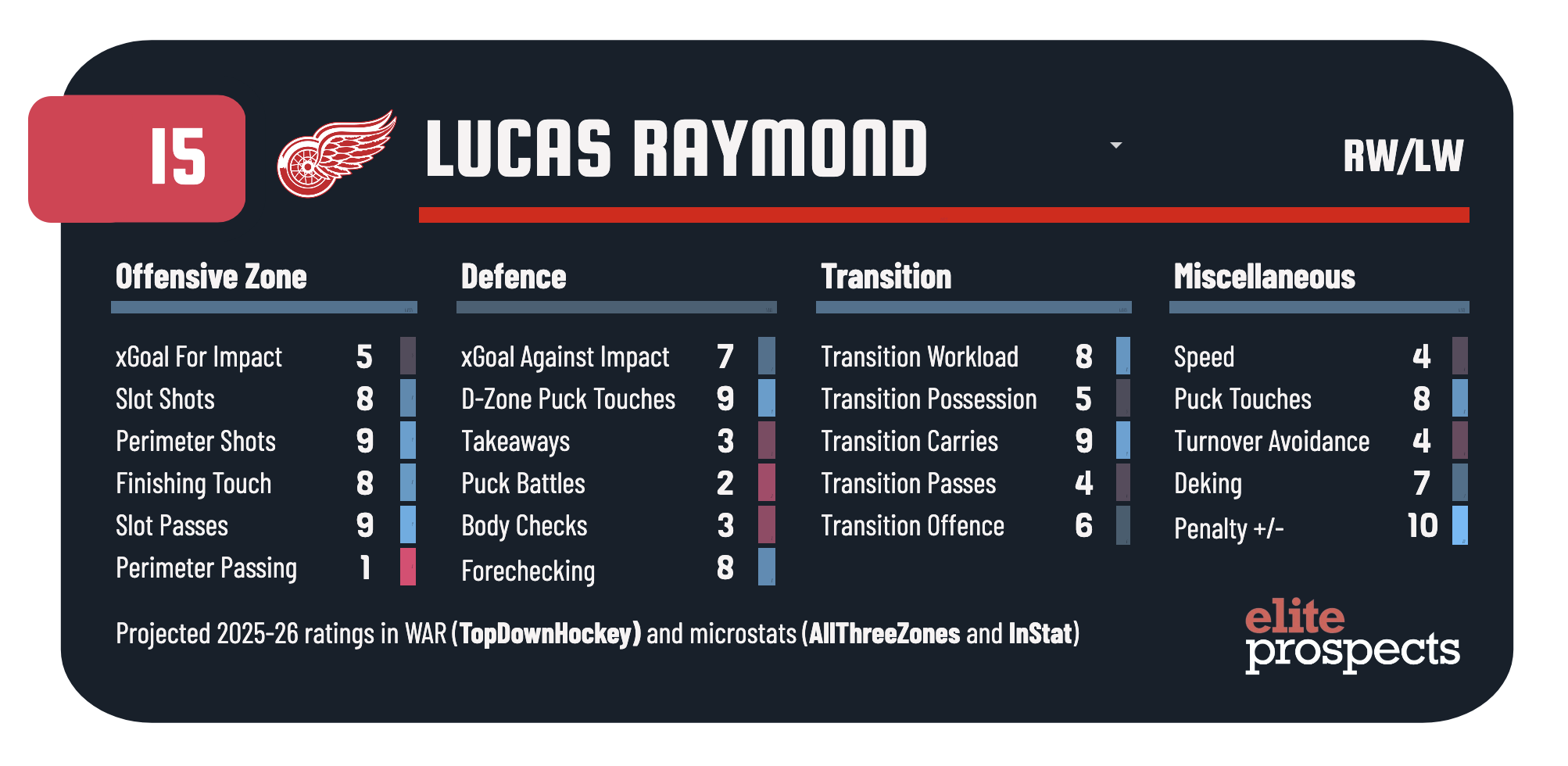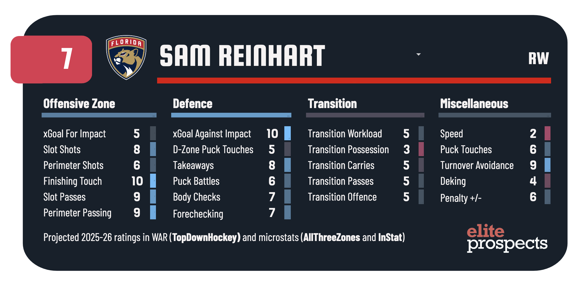 The graphics, inspired by the work done by Elite Prospects' prospect writers, include projected player ratings for the 2024-25 season in four categories: offensive zone play, defence, transition play, and miscellaneous. Departing from the percentile rankings I use on my player cards, here I use a 1-to-10 rating based on projected finish to respect the uncertainty at play here. The idea is to provide a broad impression of every player's strengths and weaknesses and give you as accurate an impression as possible of how they play.