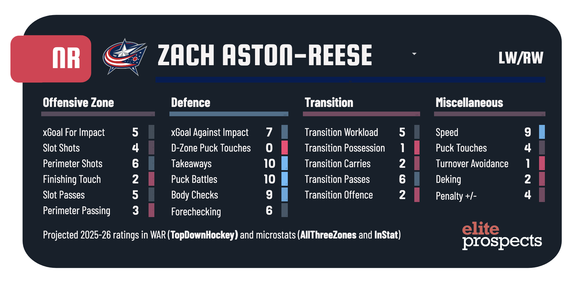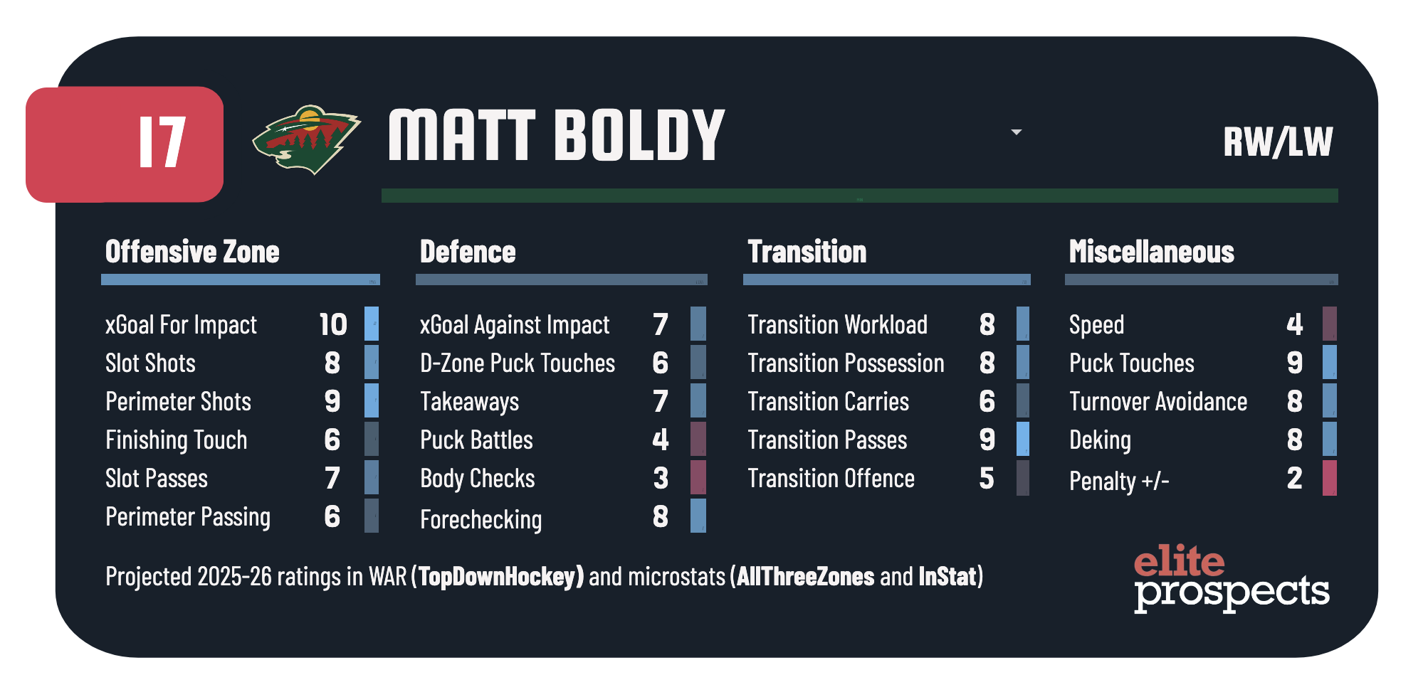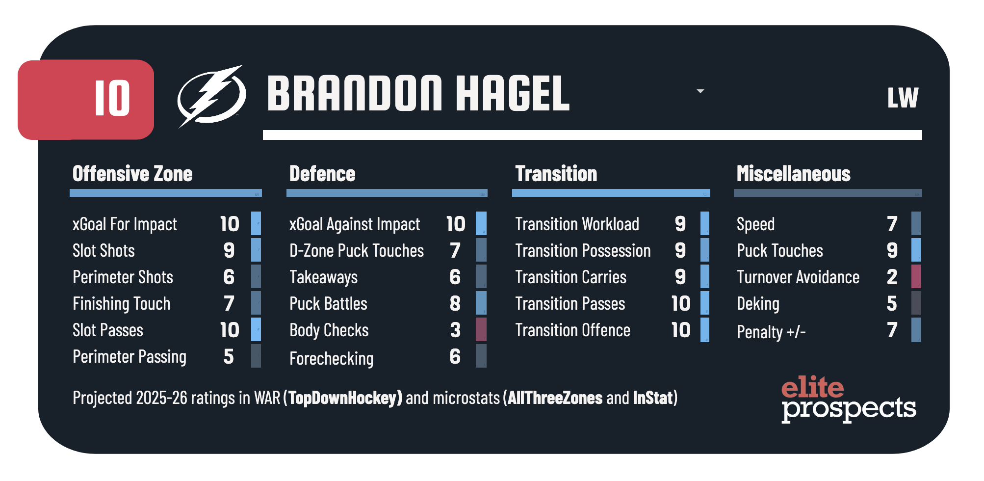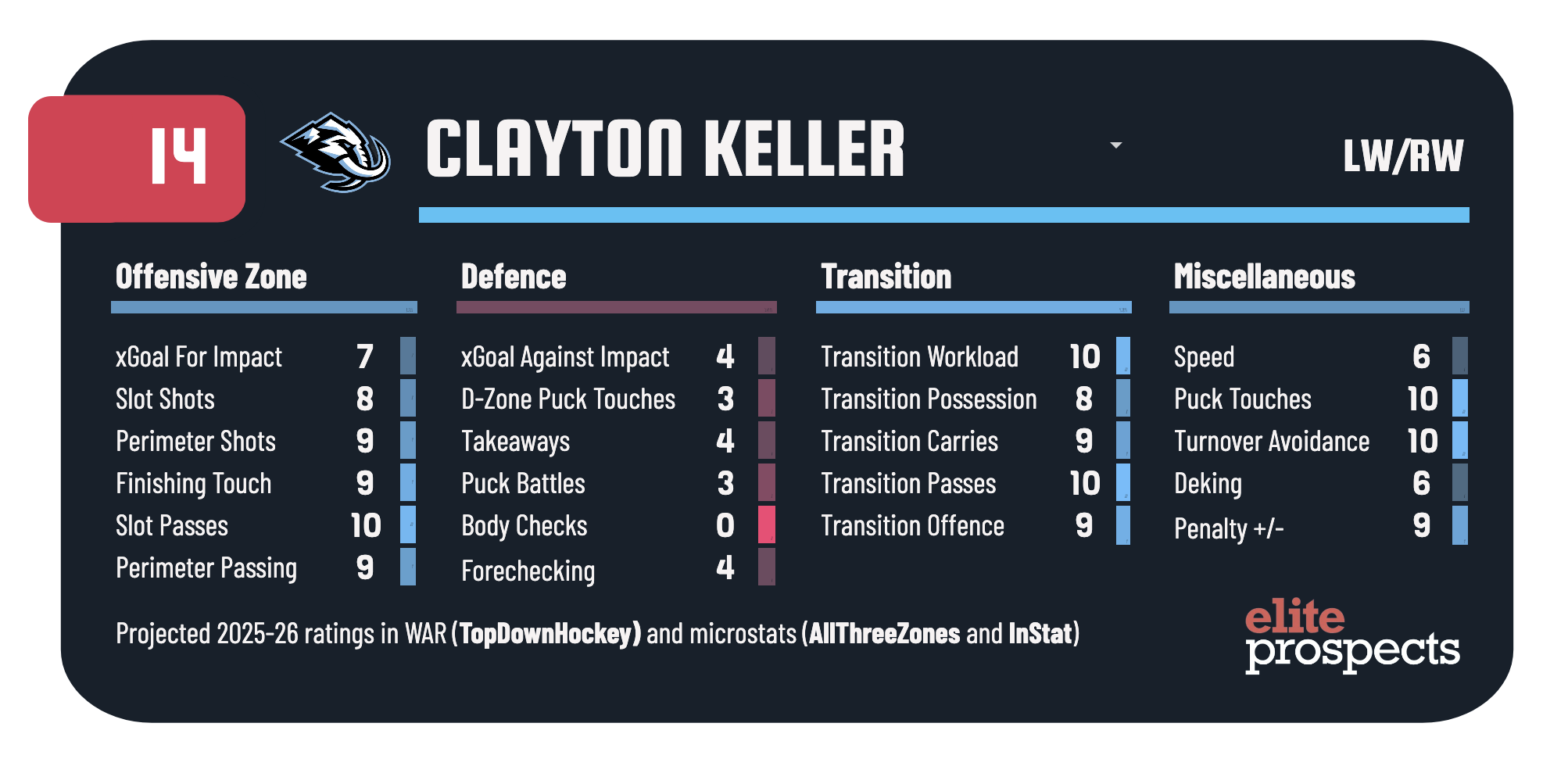 The graphics, inspired by the work done by Elite Prospects' prospect writers, include projected player ratings for the 2024-25 season in four categories: offensive zone play, defence, transition play, and miscellaneous. Departing from the percentile rankings I use on my player cards, here I use a 1-to-10 rating based on projected finish to respect the uncertainty at play here. The idea is to provide a broad impression of every player's strengths and weaknesses and give you as accurate an impression as possible of how they play.