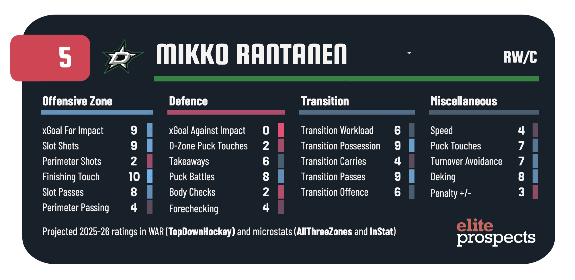 Mikko Rantanen’s stock wasn’t in the best shape in spring 2025, coming off a disappointing stint in Carolina and a solid but unremarkable stretch run with his permanent new team in Dallas. Then, in just a few playoff games, he reminded everyone why he’s been held in such high regard for years. Because he’s not as puck-dominant as the vast majority of star producers, he can occasionally fade into the background a bit, but when he’s on few can match his combination of size, puck-protection, passing skill, and finishing touch. He’s a dream linemate offensively who makes great simple plays along the wall, commands space in the net-front, and can be counted upon to make the most of the chances he’s given. His greater reliance on who he plays with and his poor defensive impact hurt him relative to some of his peers, but it’s hard to ignore the seven straight post-seasons above a point-per-game.