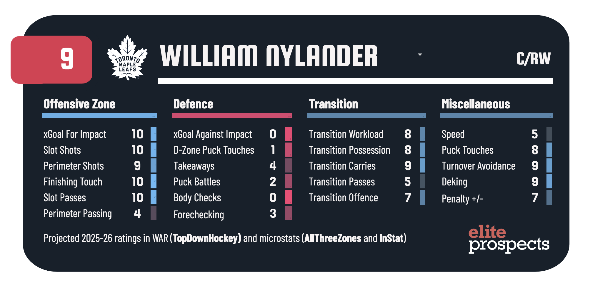 Now the Leafs’ undisputed franchise winger, William Nylander is firmly in the prime of his career and consistently producing 40-goal, point-per-game seasons while earning fans’ respect as a playoff performer. His ability to put the puck in the net in practically any way, whether by wiring wrist shots from above the hashmarks, slamming home cross-ice one-timers, dangling the goalie on a breakaway, or crashing the net, combines with slick play-making ability and puck skills to make him one of the deadliest 5-on-5 offence creators in the league. The defence (and certainly the physicality) will likely never be there, but there's a level of offensive impact that makes those sacrifices acceptable, and Willy's got it.
