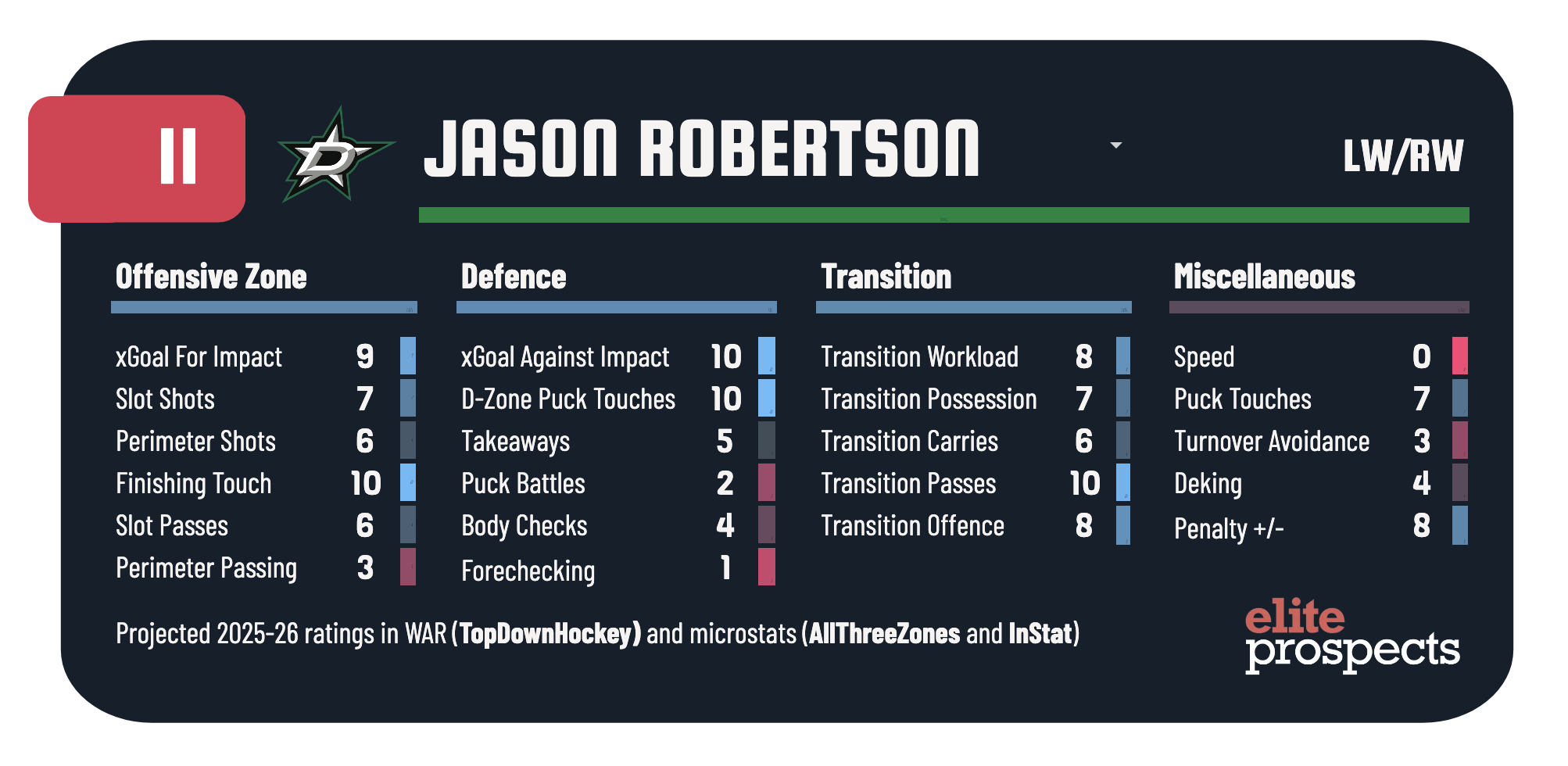 After two 40-goal seasons and a 109-point campaign it seemed as though Jason Robertson was done being disrespected. Apparently not! Trade rumours surrounded the 26-year old ahead of his pending restricted free agency in 2026, with many doubting whether he’ll deserve the big extension he’s due for after scoring at an 80+ point pace in four straight seasons. He admittedly may lack the speed, agility, and puck skills that are typically characteristic of elite producers but he makes up for it with size, smarts, and a heavy and accurate wrist shot. Sure, he doesn’t blaze down the ice at top speed, but he makes clever, subtle plays in transition to advance the play to his linemates and give himself room to get to soft spots on the ice. He’ll punish defenders who give him space and isn’t above playing through contact to grab garbage goals as well. His defensive value has also been underrated as he’s become a serious two-way ice-tilter who gets to loose pucks and initiate zone exits.