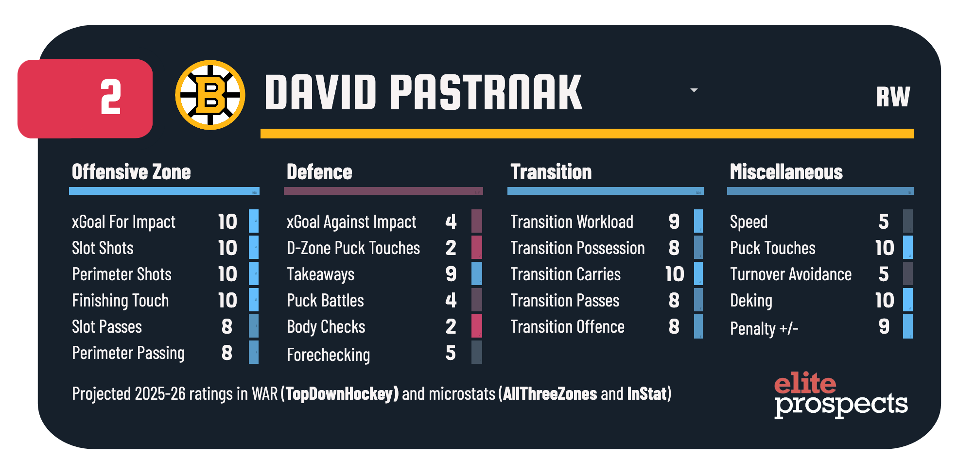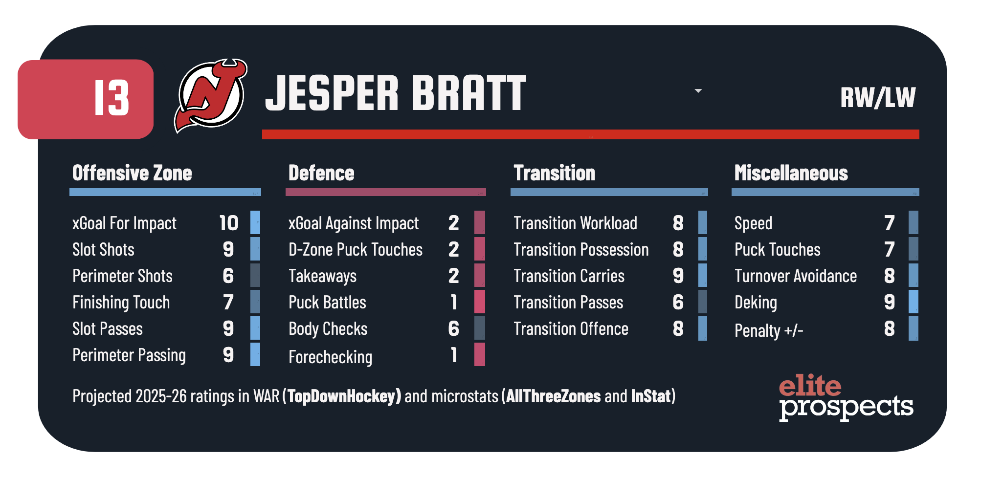 With Jack Hughes so often on the shelf, Jesper Bratt has become the Devils’ most important (or at least impactful) offensive player, leading the team in points two years in a row including a career 67-assist, 88-point performance in 2024-25. His dynamic rush play and passing ability make him one of the most prolific drivers of 5-on-5 offence in the league and he makes everybody he plays with better. Defence isn't exactly his strong suit and he mostly stays above the fray and waits for chances to push play up-ice, but it's a formula that works for him and his offence more than makes up for it.