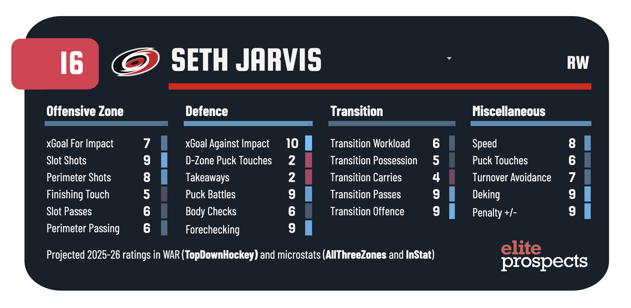 In a league where size is once again paramount, Seth Jarvis’ example might provide a critical counter-comparable for young undersized players hoping to break into the league. Drafted as a high-upside offensive player, Jarvis forechecked and battled his way to an unexpected but well-deserved spot on Team Canada in 2025, balancing finesse and hard work to establish himself as not only a consistent 30-goal threat and slot shot machine but among the league’s best defensive forwards. He breaks through the Canes system with plenty of rushing flair while exemplifying the best qualities of their intense possession system, playing through contact and exerting maximum pressure on top competition. He has the passing skill to reach another level too.