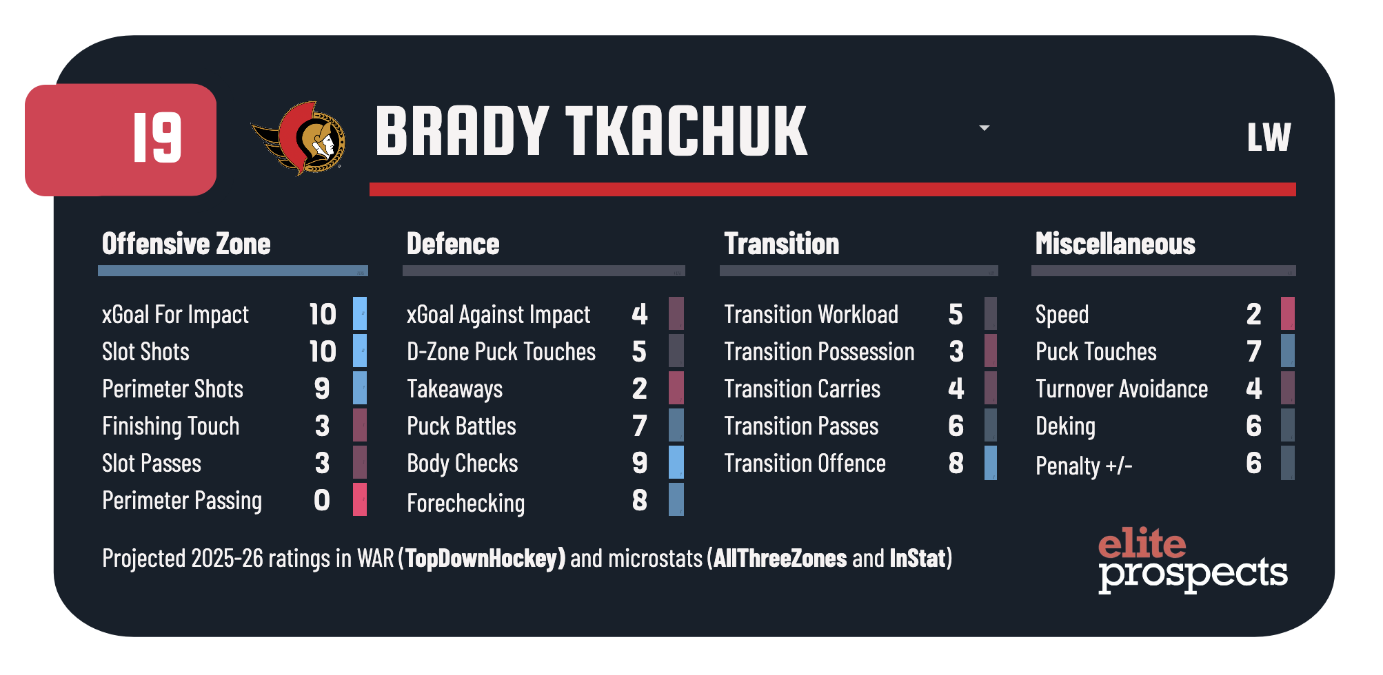 2025 was a big season for Brady Tkachuk: he and his brother were the face of American hockey following a gusty and pugilistic showing at the 4 Nations and he played his first NHL playoff games. Amid all of this it was easy to forget that his 55 points were his lowest total and pace since 2020-21. Nonetheless, he kept doing his usual thing, finishing top five in shots, slot shots, inner slot shots, rebounds, cycle shots, and forecheck shots. If it involved firing a puck towards the net, Tkachuk did it. It wasn’t a banner year for his inconsistent playmaking but he did improve his defensive impact quite a bit, not getting caught deep on the backcheck as often and participating in his own zone more.