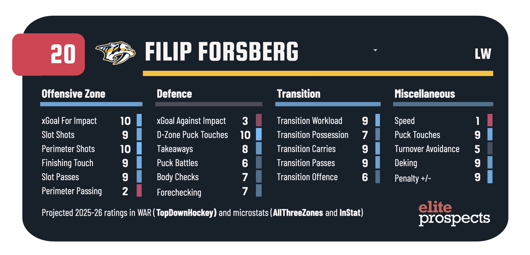 Even as the Predators’ grand “unrestricted free agency our way to contention” plan completely imploded, Filip Forsberg still managed to tally his obligatory 30 goals and flirt with another point-per-game season. His skill-set is pretty well-insulated from everything around him being a disaster because he’s so puck-dominant and can score from pretty much everywhere. His trademark dangling remains a core part of his game and leads to some seriously pretty goals as he carves his way through the offensive zone, and even though his straight-line speed isn’t what it used to be he doesn’t need a lot of strides to get where he wants to go. When he’s really clicking he’s a dedicated puck hound who disrupts plays in all three zones and turns takeaways into counter-attacks, and his passing game is high-ceiling although he usually elects for the safe option to the point (which is fair when Roman Josi is the guy waiting there).