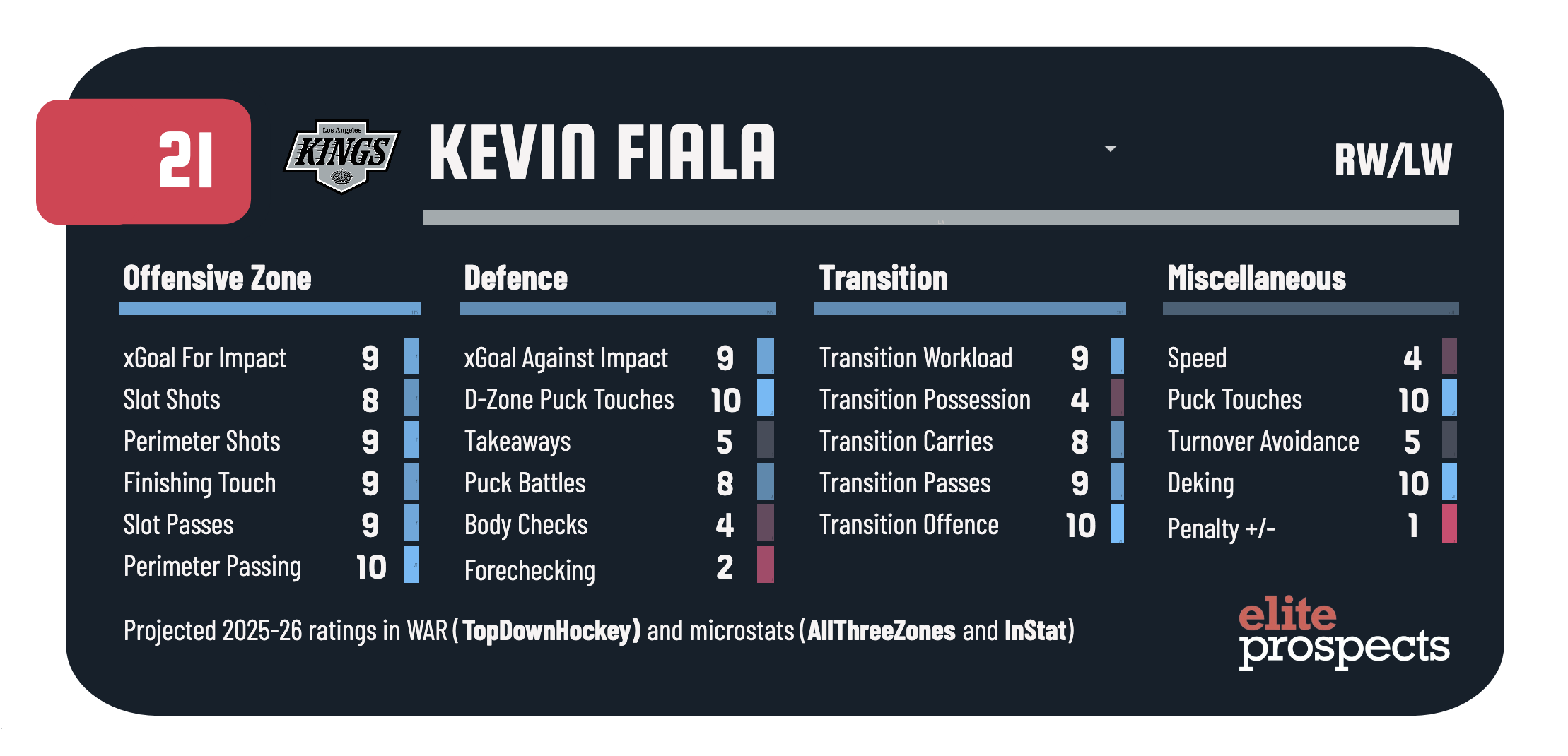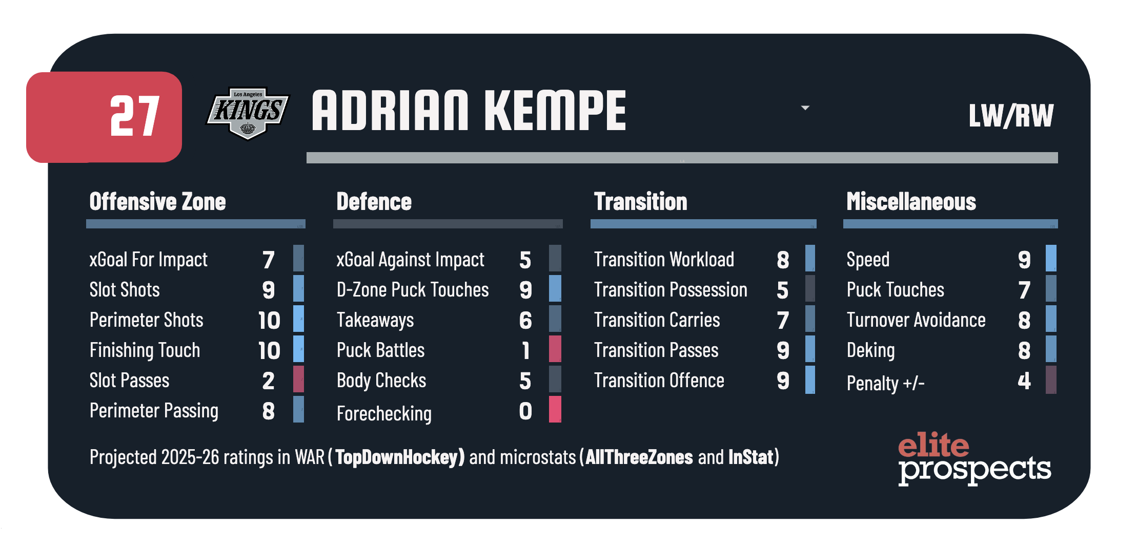 One of the league’s best rush attackers, Adrian Kempe has scored at a 35-goal pace in the past four seasons and added 13 in his past 17 playoff games in large part by bolting up-ice with a head of steam, backing defenders off, and then wiring pucks in from distance. His catch-and-shoot wrister is lethal and he’s great at playing give-and-go in transition as well. He's not a fully well-rounded player, although he’s great on the penalty kill and known to throw insane hip checks when covering for the defence, but he’s a very productive first liner.