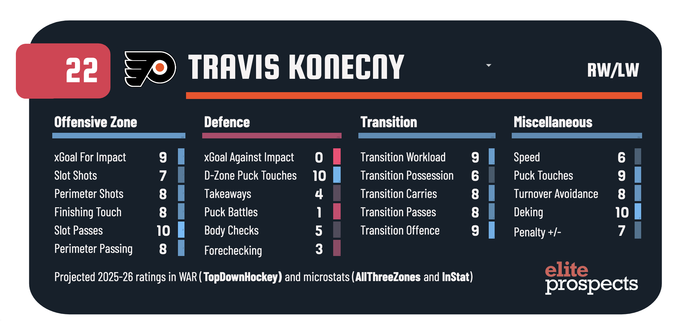 Not many players in the league are more creative than Travis Konecny, and few share his mastery of the rush game. He has the hands and vision to take unconventional routes through the neutral and offensive zones, the short-burst acceleration to blow past defenders, the awareness to open up passing lanes and slip pucks over or under the sticks of blueliners, and a curl-and-drag wrister that can beat goalies consistently. Team Canada also saw a high motor and solid defensive stick suitable for a bottom-six forechecking role, but given his centrality to the Flyers’ offence (which he has led in scoring for four straight seasons) he is very much more focused on blowing the zone early and playing run-and-gun than preventing chances against.