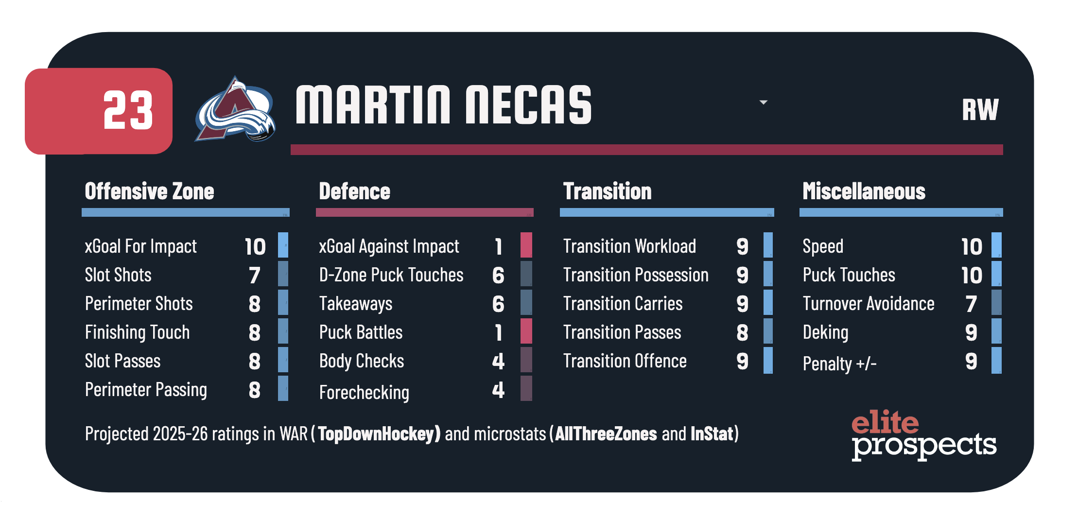 It was probably pretty fun to be Martin Nečas last season, not only producing at a point-per-game pace for the first time in his career (including, it’s easy to forget, 55 in 49 for the Hurricanes before the trade to Colorado), but enjoying a bigger stage for his considerable talents next to an MVP contender. The dynamic skills he showcased next to Nathan MacKinnon, like the high-speed end-to-end rushes, the dekes through multiple defenders, the dizzying high cycles, and the high-danger feeds into the slot were all there before, but playing next to a guy who can not only skate and think as quickly as him but is also fully willing to attack creatively has helped him level up.