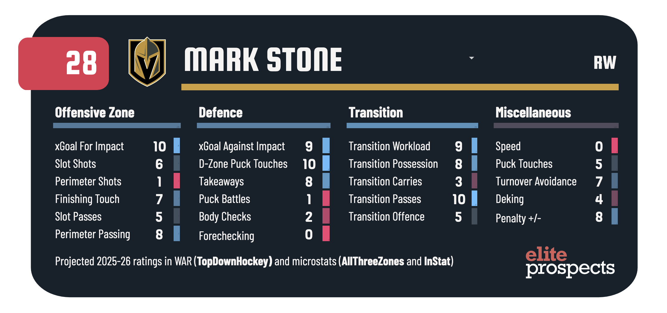 At 33, Mark Stone still has plenty of ability but not quite as much availability as you'd like to see. When he's healthy, he remains one of the NHL's top two-way play-drivers through elite hockey I.Q. and a kleptomaniacal defensive game that go hand-in-hand to make him an ideal linemate. He hounds opponents with flurries of stick checks, intercepts passes with the shaft of his stick, and uses his hands and awareness to navigate the puck out of trouble and get it to a teammate right away. Even though his speed – always a weakness – is falling off even more, he's the master of the area pass to a teammate with wheels and advances the puck through playmaking rather than carrying it end-to-end himself. The volume of chance creation wasn't what it usually is in 2024-25 and it will be interesting to see how he performs this season with heir apparent Marner taking up more ice time.