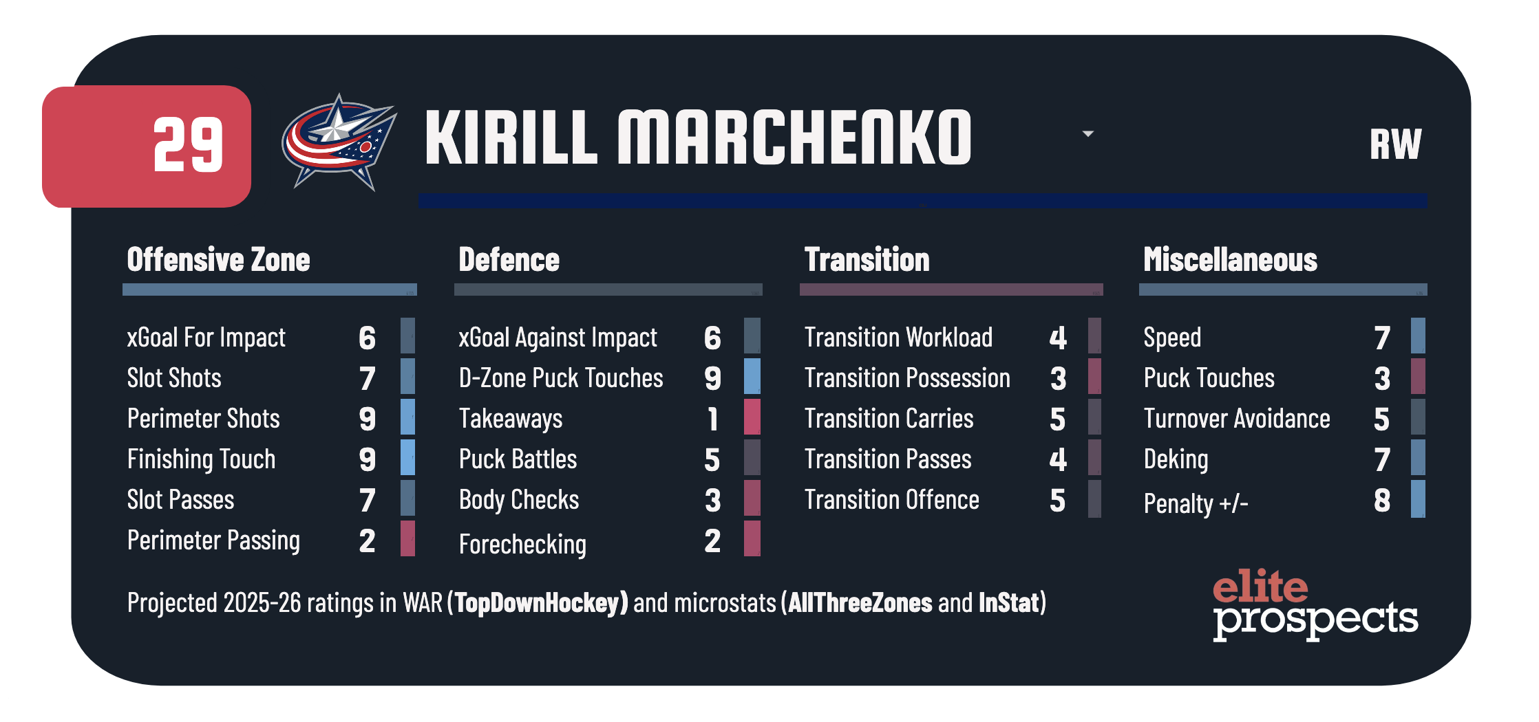 Few players enjoyed the glow-up that Kirill Marchenko did in the 2024-25 season. While he showed promise before, his 31-goal, 74-point campaign cemented him as one of the most electrifying players in the league (even if most fans haven’t noticed yet). I don’t know this for sure, but I’m guessing his favourite player growing up was Pavel Datsyuk based on his sheer ambition and creativity with the puck; it seems as though he’s not happy with a shift unless he’s completely embarrassed at least one defender and maybe the goaltender with a sick curl-and-drag move or by crossing them up through the triangle. Good acceleration and a solid 6’3 frame give him that extra push to pull off unbelievable moves, and slick playmaking combined with one of the silkiest wrist shots in the game allow him to take advantage of the space he creates with his hands.