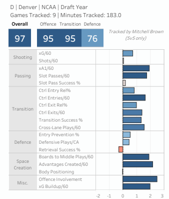 His NHL game has been tilted toward the offence, but we anticipate that he will become a much more well-rounded player as he matures, just like he was in college. In fact, it was mostly his play in the neutral and defensive zone that made us value him so highly in his draft-year:
