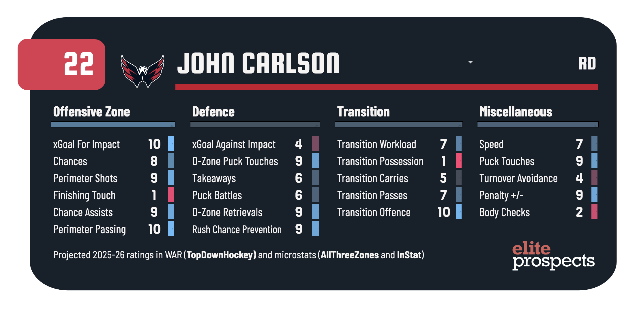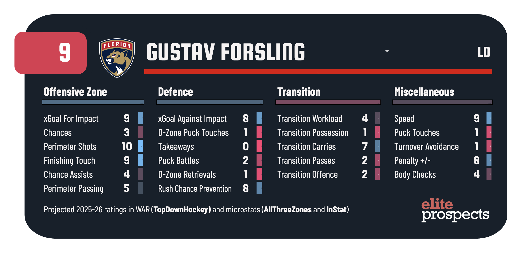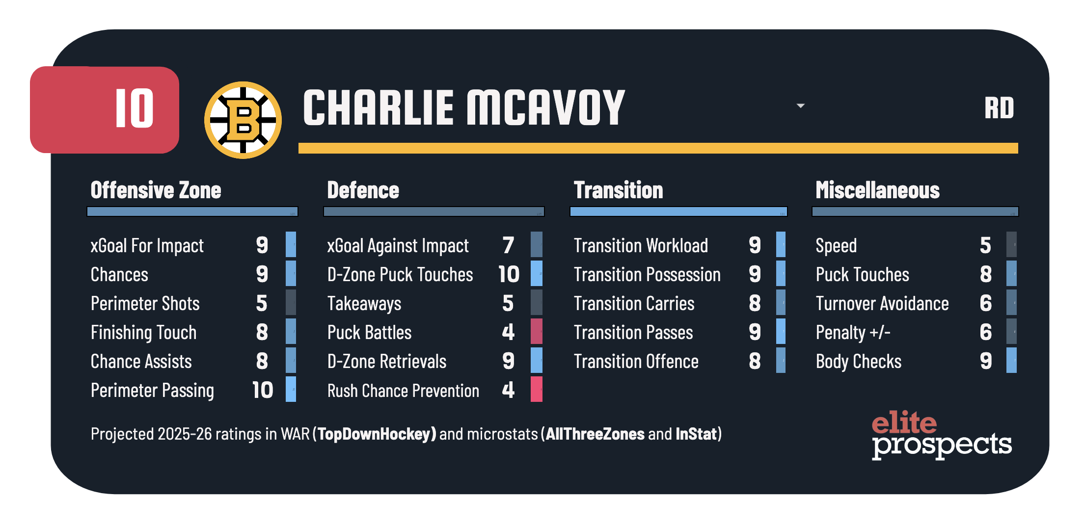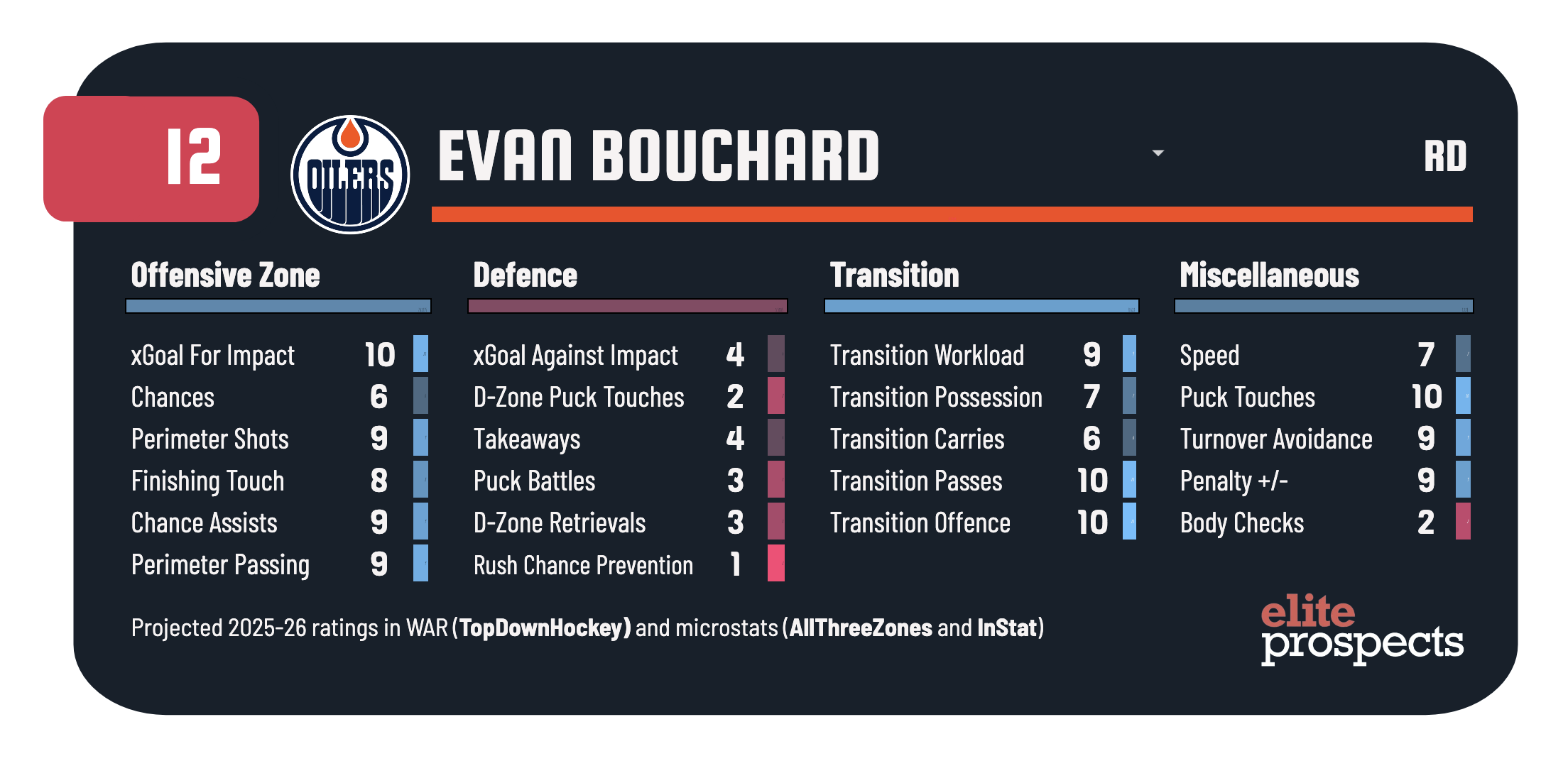 The graphics, inspired by the work done by EP's prospect writers, include projected player ratings for the 2025-26 season in four categories: offensive zone play, defence, transition play, and miscellaneous. Departing from the percentile rankings I use on my player cards, here I use a 1-to-10 rating based on projected finish to respect the uncertainty at play here. The idea is to provide a broad impression of every player's strengths and weaknesses and give you as accurate an impression as possible of how they play.