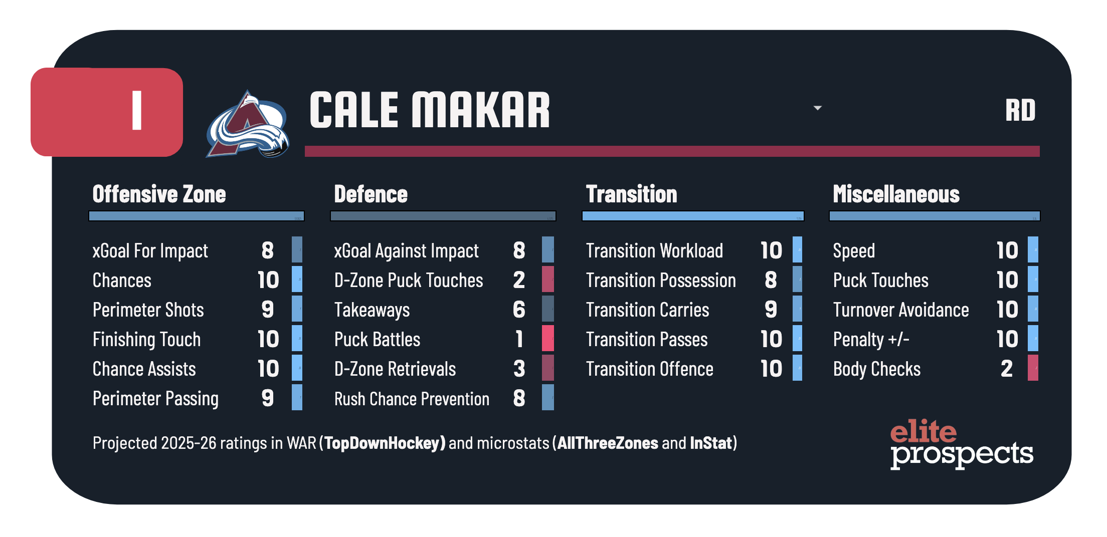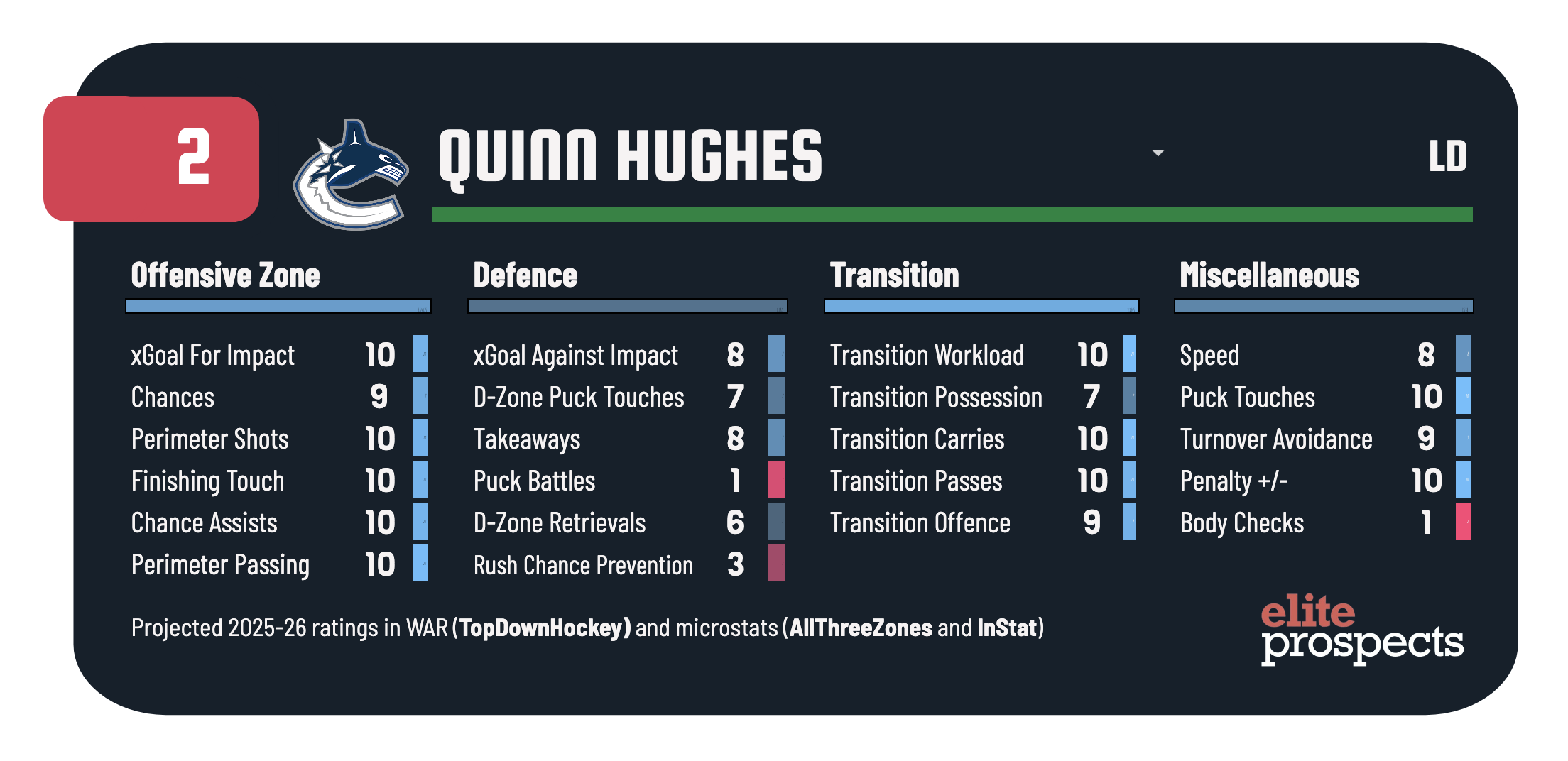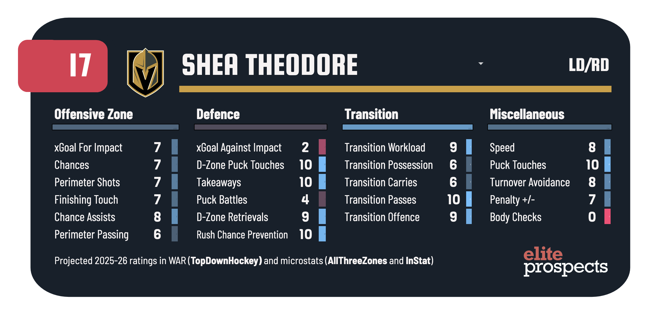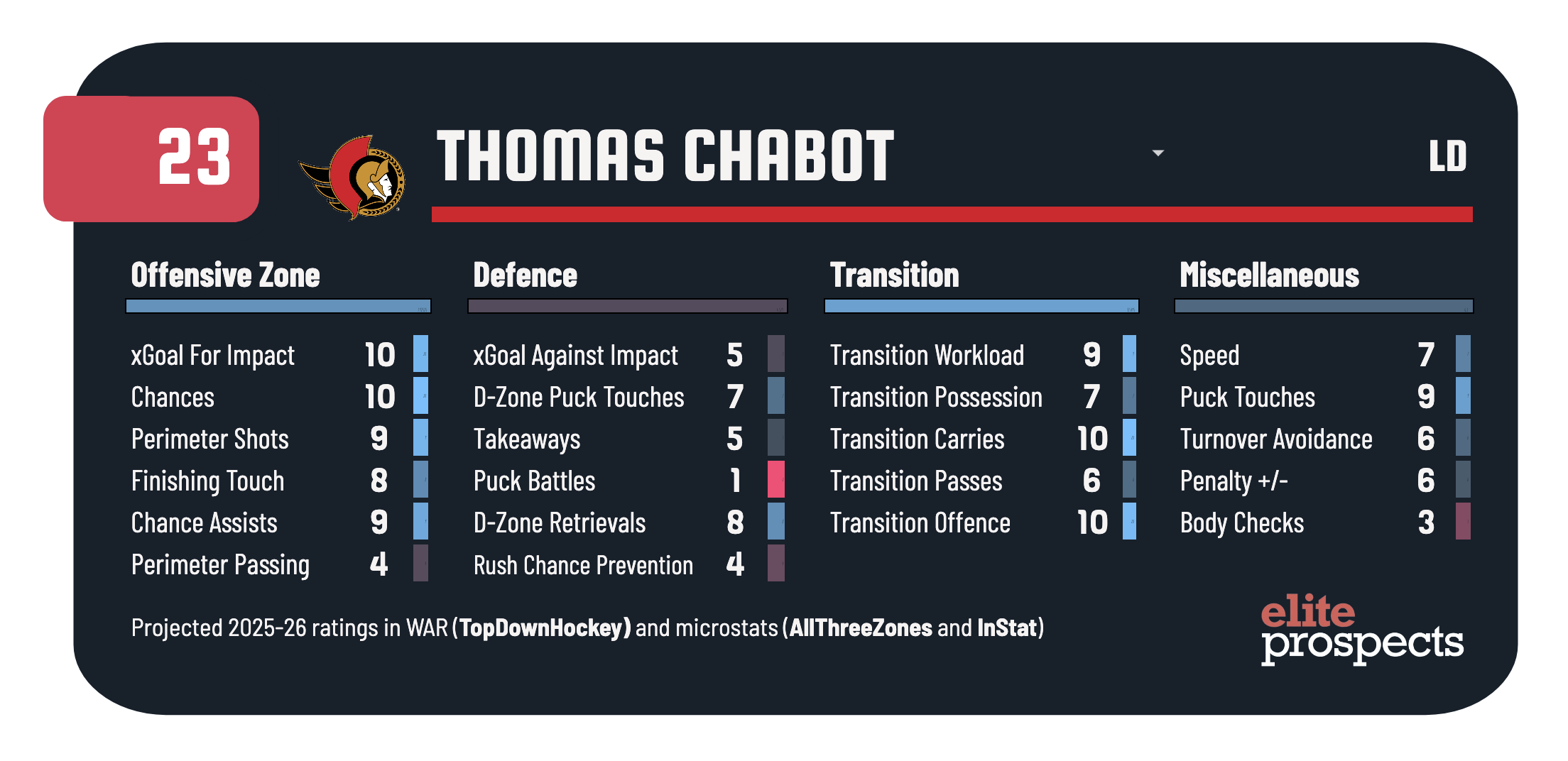 The graphics, inspired by the work done by EP's prospect writers, include projected player ratings for the 2025-26 season in four categories: offensive zone play, defence, transition play, and miscellaneous. Departing from the percentile rankings I use on my player cards, here I use a 1-to-10 rating based on projected finish to respect the uncertainty at play here. The idea is to provide a broad impression of every player's strengths and weaknesses and give you as accurate an impression as possible of how they play.