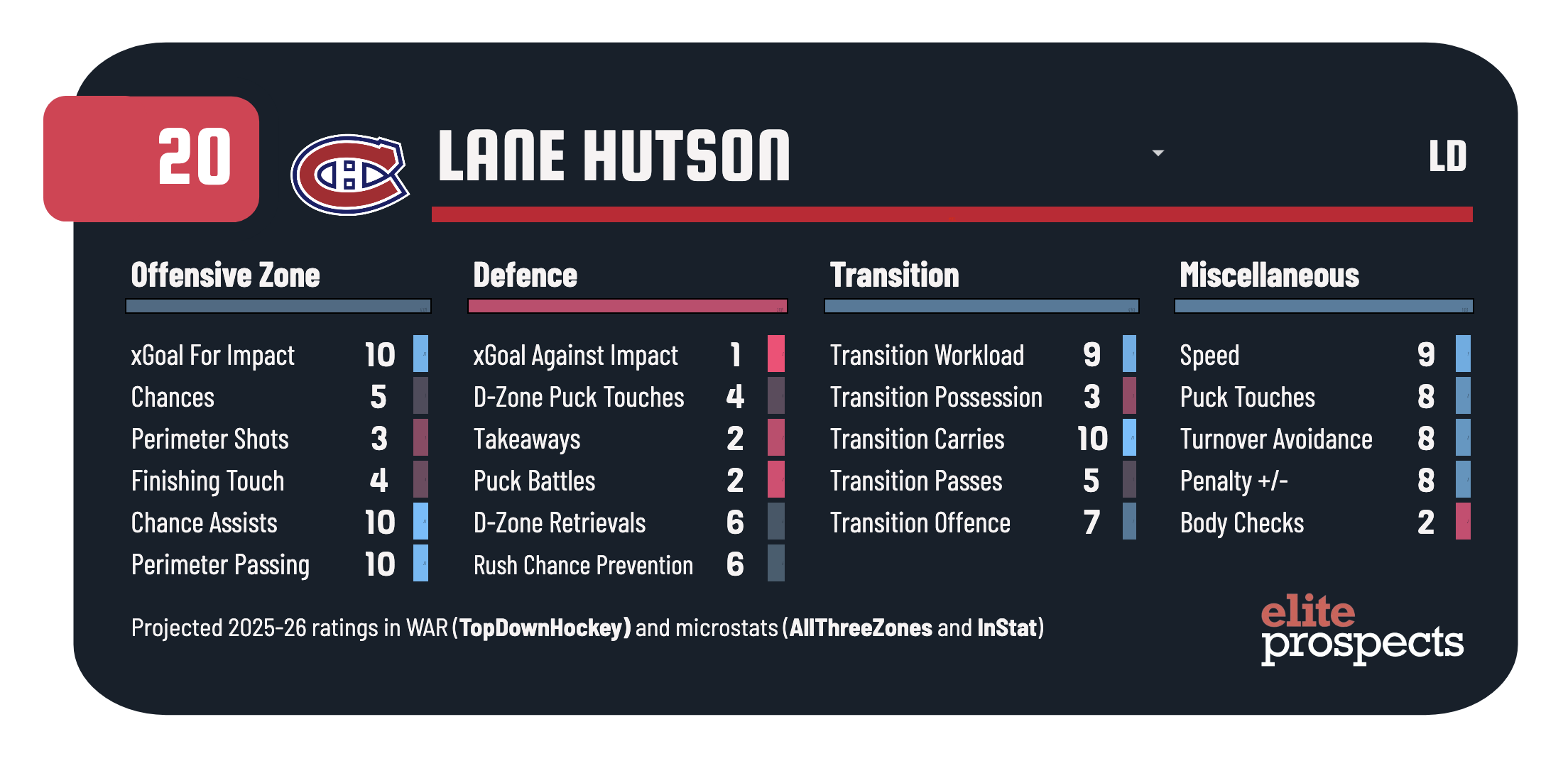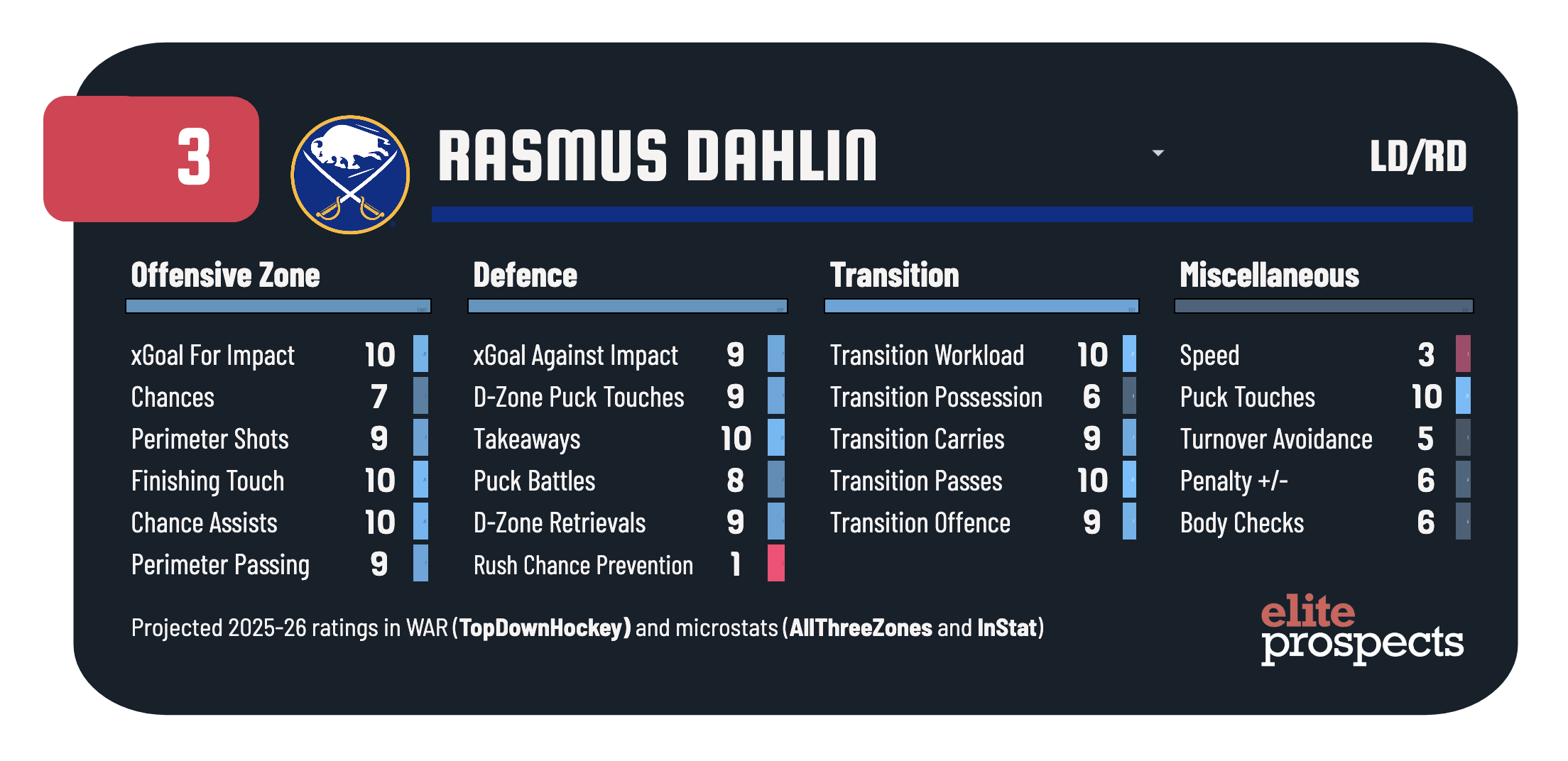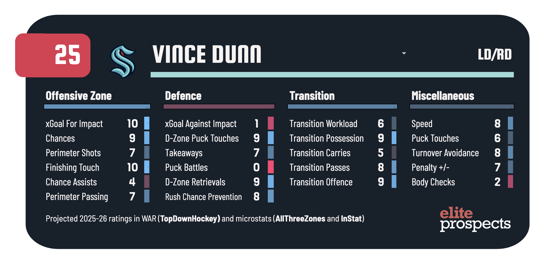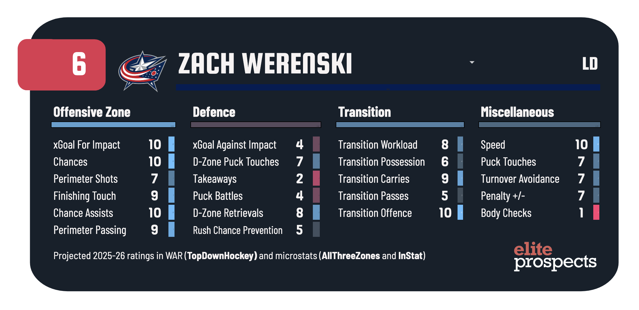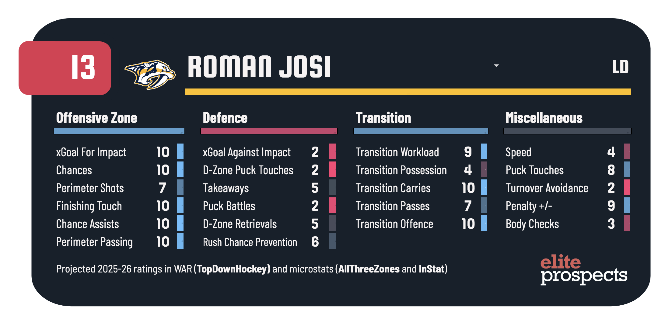 The graphics, inspired by the work done by EP's prospect writers, include projected player ratings for the 2025-26 season in four categories: offensive zone play, defence, transition play, and miscellaneous. Departing from the percentile rankings I use on my player cards, here I use a 1-to-10 rating based on projected finish to respect the uncertainty at play here. The idea is to provide a broad impression of every player's strengths and weaknesses and give you as accurate an impression as possible of how they play.
