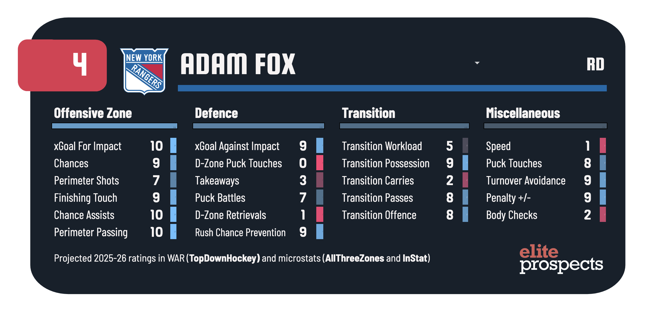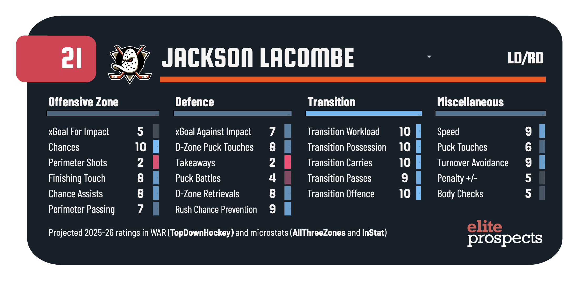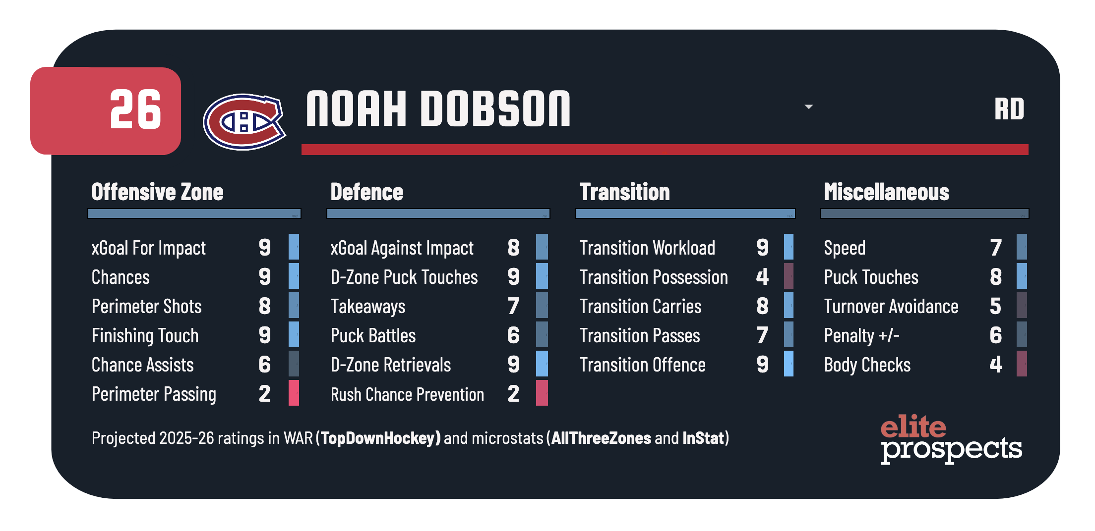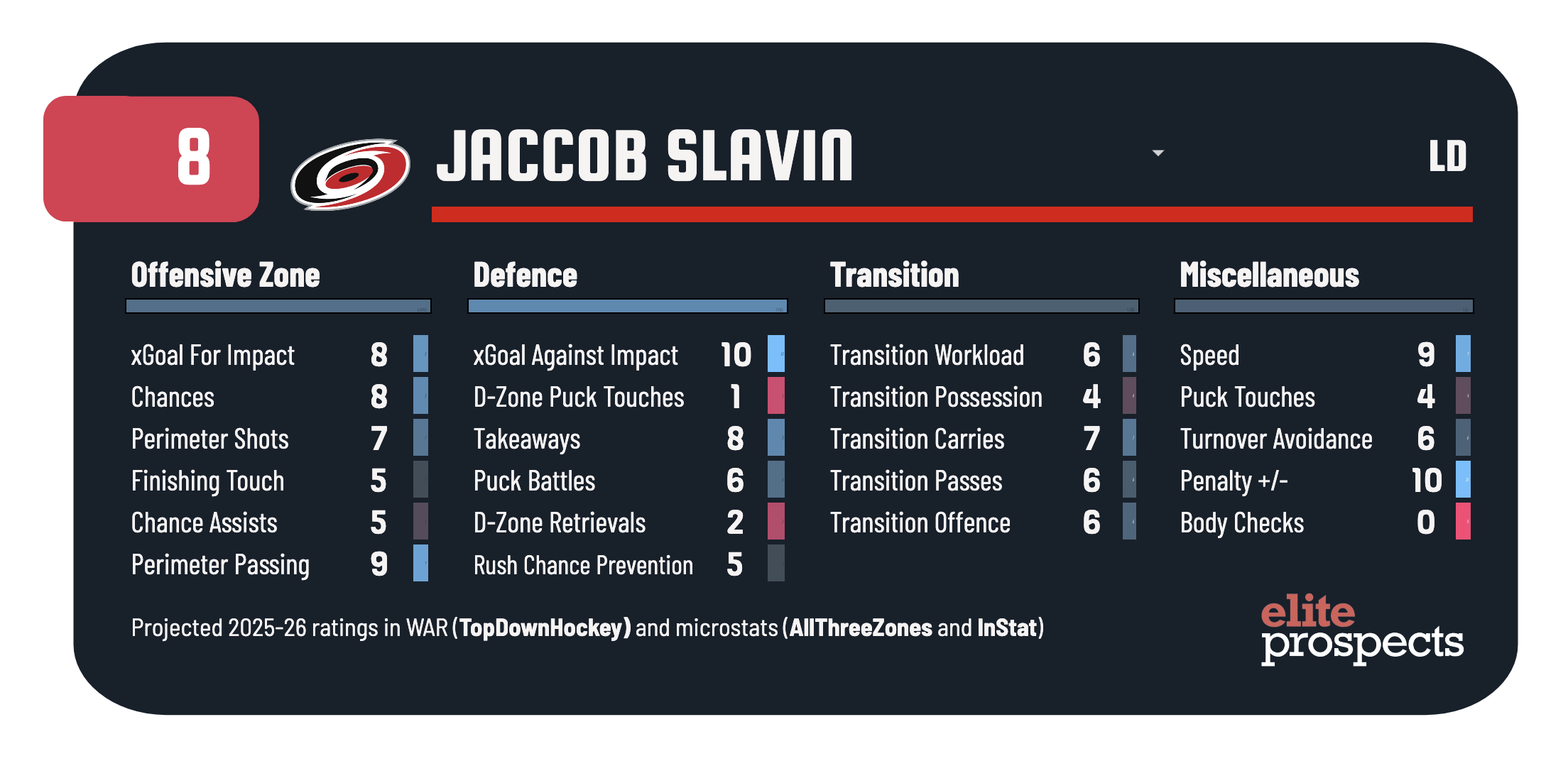 The graphics, inspired by the work done by EP's prospect writers, include projected player ratings for the 2025-26 season in four categories: offensive zone play, defence, transition play, and miscellaneous. Departing from the percentile rankings I use on my player cards, here I use a 1-to-10 rating based on projected finish to respect the uncertainty at play here. The idea is to provide a broad impression of every player's strengths and weaknesses and give you as accurate an impression as possible of how they play.