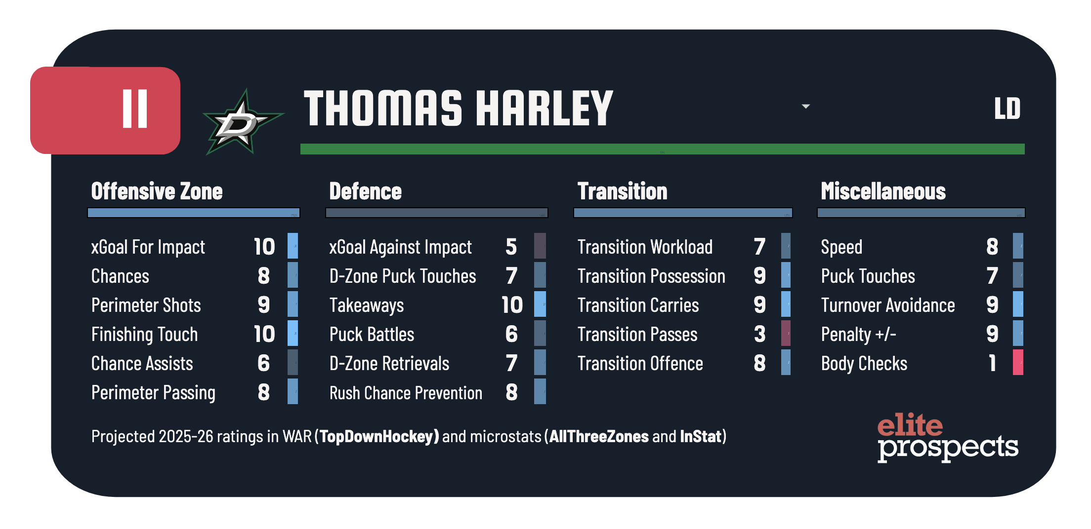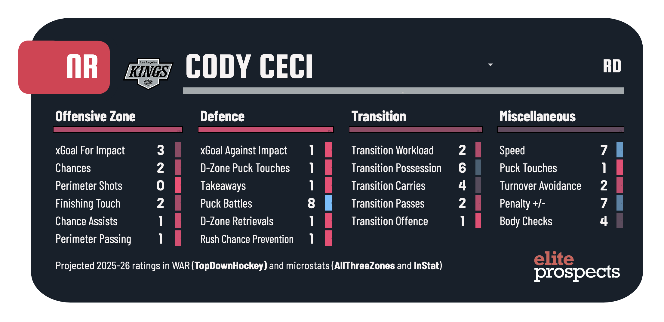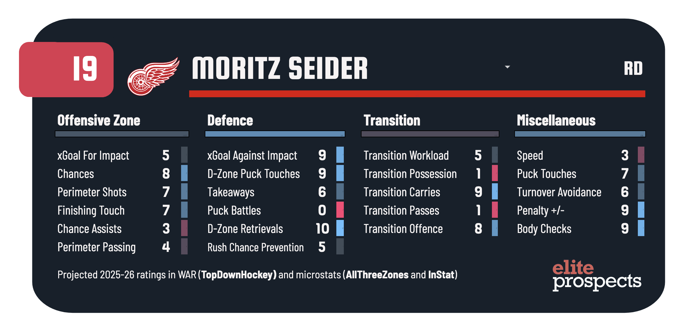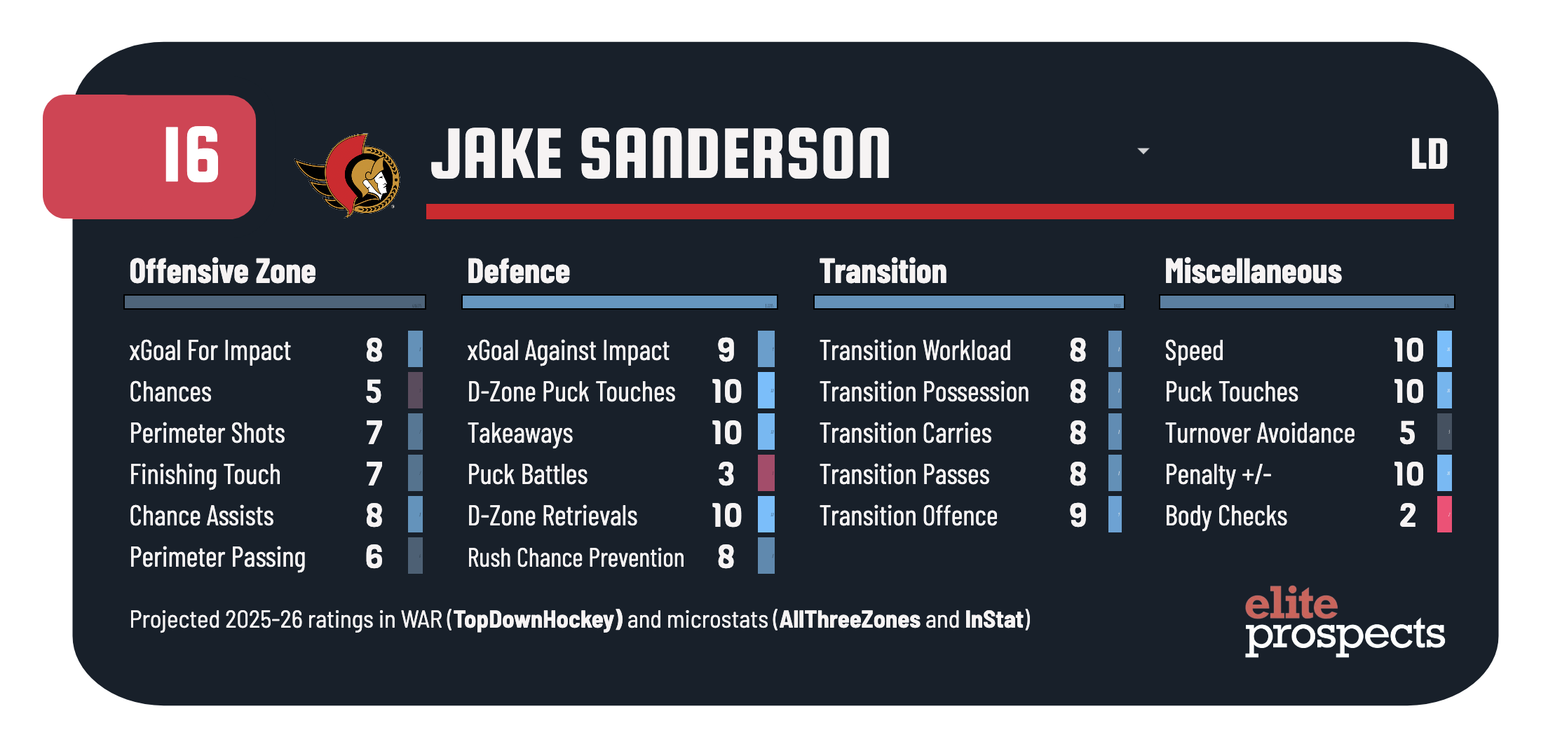 The graphics, inspired by the work done by EP's prospect writers, include projected player ratings for the 2025-26 season in four categories: offensive zone play, defence, transition play, and miscellaneous. Departing from the percentile rankings I use on my player cards, here I use a 1-to-10 rating based on projected finish to respect the uncertainty at play here. The idea is to provide a broad impression of every player's strengths and weaknesses and give you as accurate an impression as possible of how they play.
