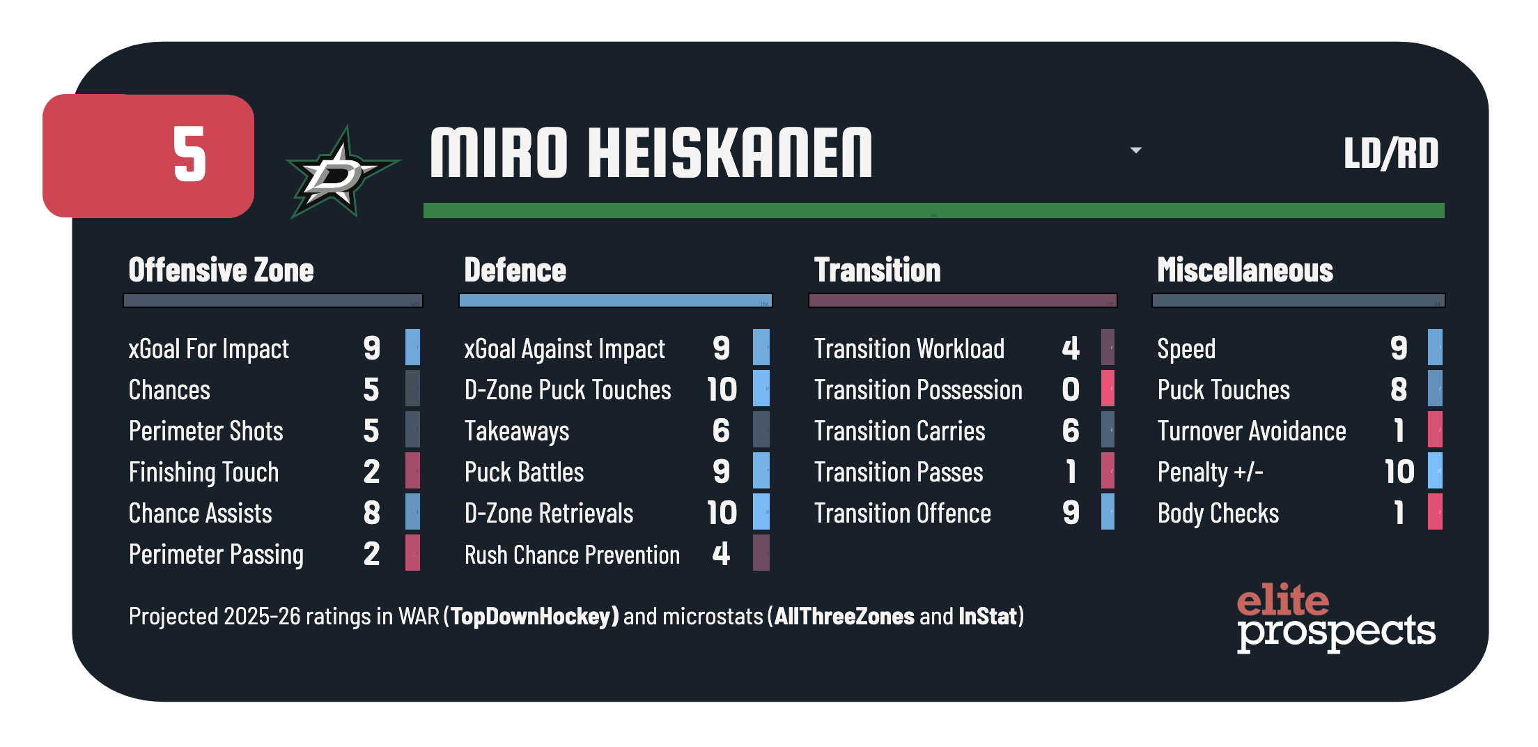 Few would argue that 2024-25 was among the better seasons of Miro Heiskanen’s career, but it speaks to his incredible track record that nobody is doubting his status as a truly elite defenceman. At his best, he’s a one-man army controlling both ends of the ice, beating everybody to loose pucks with his skating before embarking on daring end-to-end rushes that culminate in flashy passes to a streaking forward. He’s a brilliant play disruptor who suffocates opponents, engages on the wall, and gets his stick in the way of whatever they might want to do. All that skill remains in place, but he’s not getting quite as many touches as he used to, sinking a bit more in the background as the forwards do more heavy lifting with the puck and new kid on the block (and sometimes partner) Thomas Harley gets in on the fun. Even if he’s not the one on the scoreboard, he’s often the one starting the play.