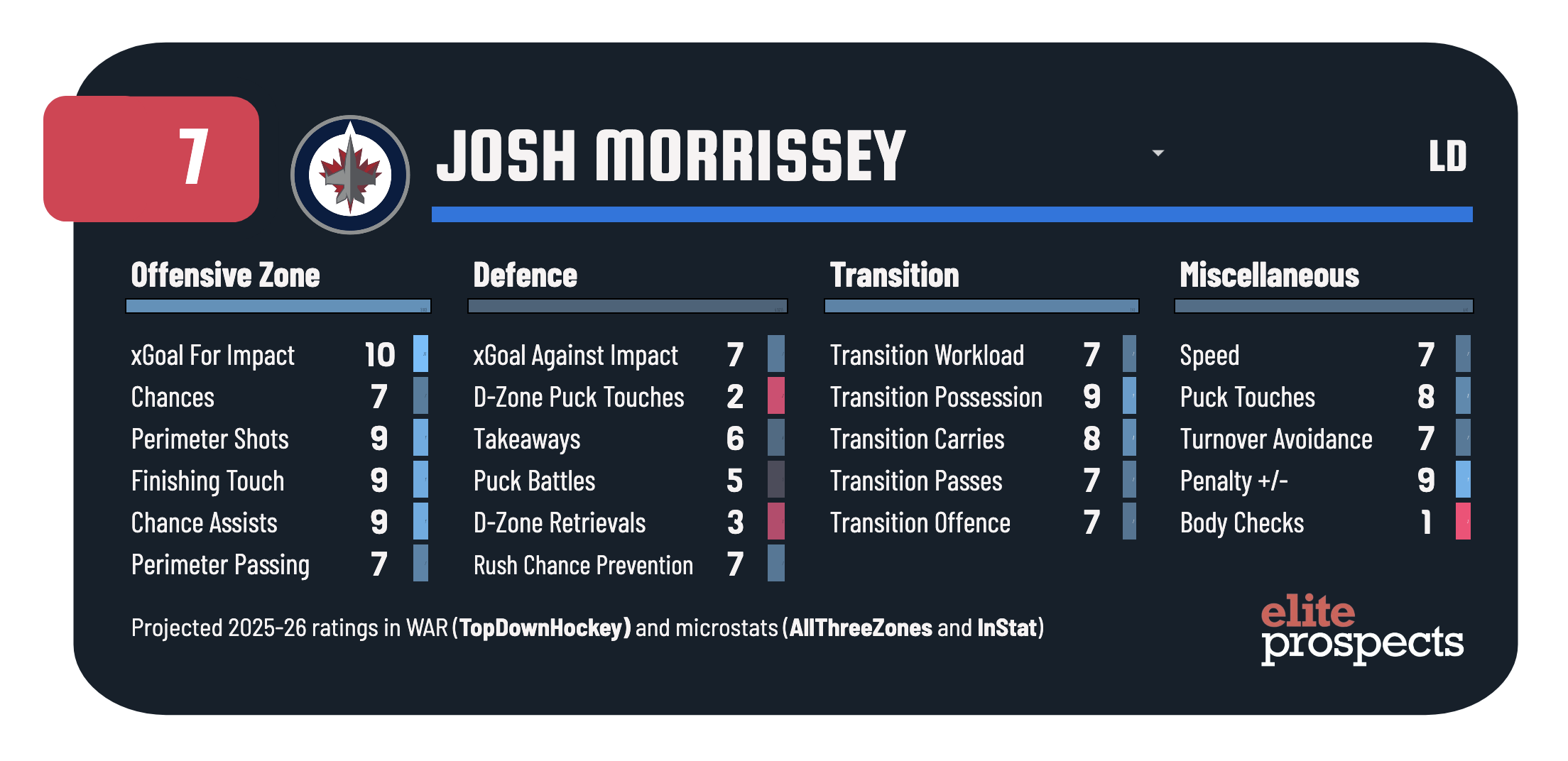 Josh Morrissey maintained his status as an elite number one defenceman for the third straight season, quarterbacking the Presidents Trophy winning Jets and finishing top-five in Norris voting for the second time in his career. His smooth skating and ever-increasing confidence with the puck on his stick has made him one of the league's premier scoring chance creators from the blueline as he's capable of joining and leading the rush, jumping up in the offensive zone, and forcing turnovers to keep plays alive. He's also managed to reclaim the strong defensive results that fell a bit by the wayside when he decided overnight to become a high-end offensive defenceman.