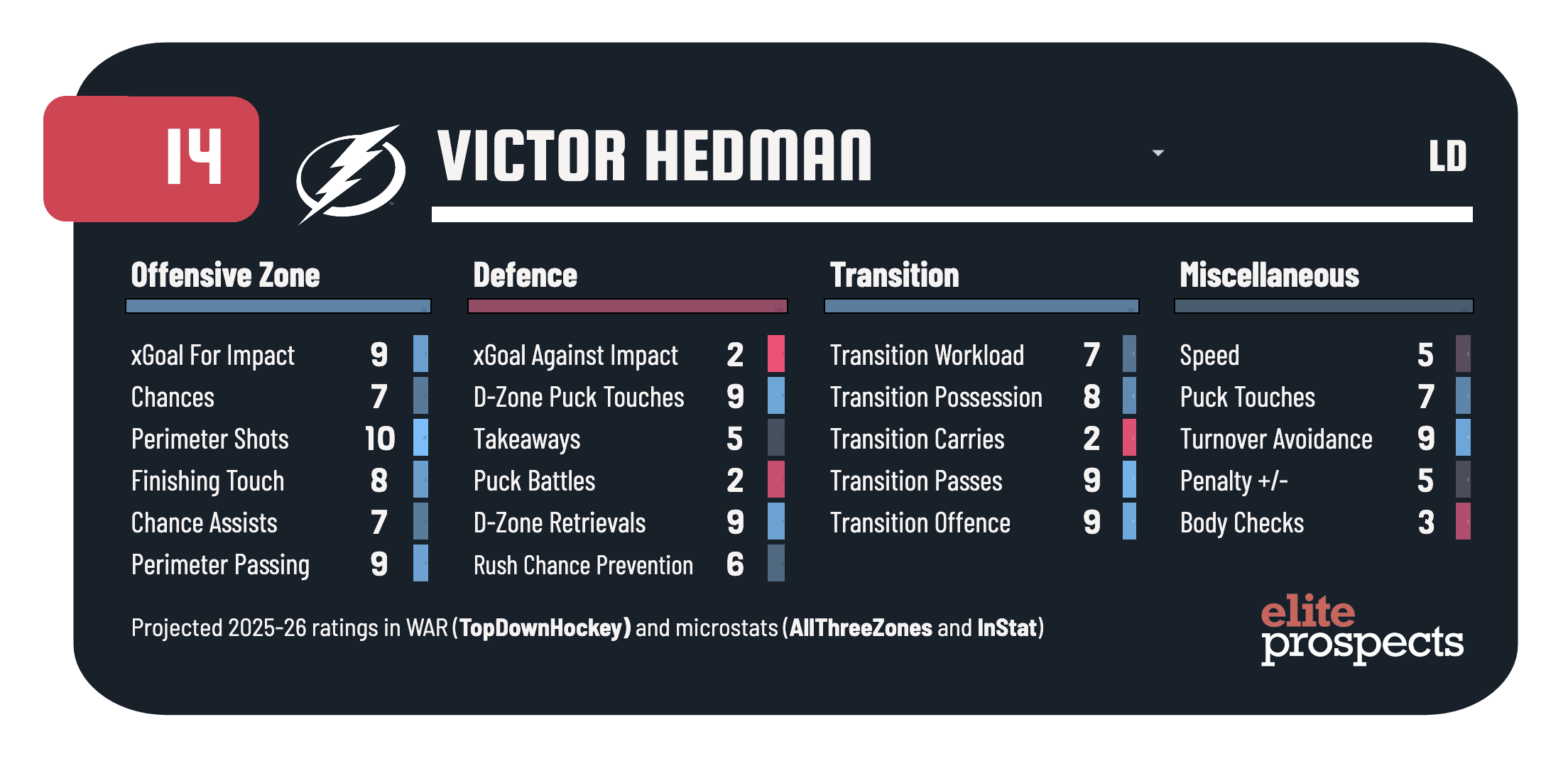 The days when hockey writers could cheat on their Norris ballots by just assuming Victor Hedman deserved a nomination might have passed, but he remains one of the most effective puck-movers in the NHL even solidly into his mid-30s. The Bolts’ decision to move Mikhail Sergachyov last offseason indicated just how confident they are in Hedman’s ability to maintain the performance of a #1 defenceman, but while I expected that move to entail an role increase, he actually saw his time on ice drop to its lowest point since 2018-19 with relatively soft deployment in terms of match-ups and zone starts. While the Lightning clearly value him mostly for his superb skill with the puck and chemistry with their top stars, that’s not to say he doesn’t still have some solid defensive chops. He’s maintained enough mobility, smarts, and strength to successfully retrieve loose pucks in his own end and he’s one of the most careful puck-managers in the league relative to his workload, even if his defence is leakier than it used to be.