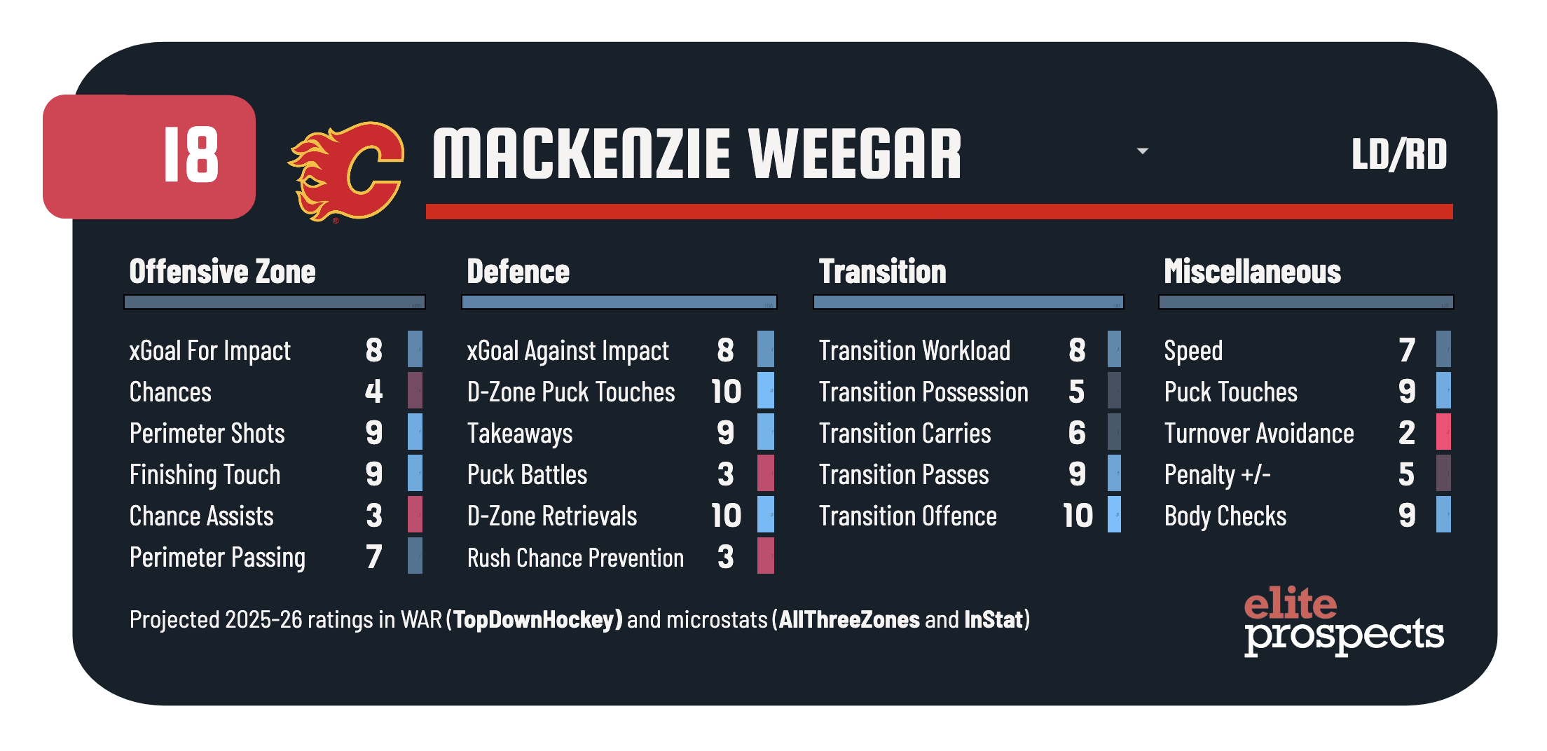 I can’t imagine it’s easy for MacKenzie Weegar to watch his former team pile up Stanley Cups while his Flames toil in mediocrity, but a number one defenceman workload and long-overdue recognition should offer some comfort. He may not be the two-way analytical darling force he was between 2020 and 2023, but he still carries an extremely heavy burden for the Flames as quite possibly the most active defender in the league; nobody is asked to do more in the defensive zone whether it’s retrieving loose pucks, breaking up passes, or defending the blueline. This did weigh on him more this season than in the past, as his turnover rate skyrocketed and his offensive contributions at 5-on-5 took a major hit, but he remains a solidly positive-impact contributor at both ends.