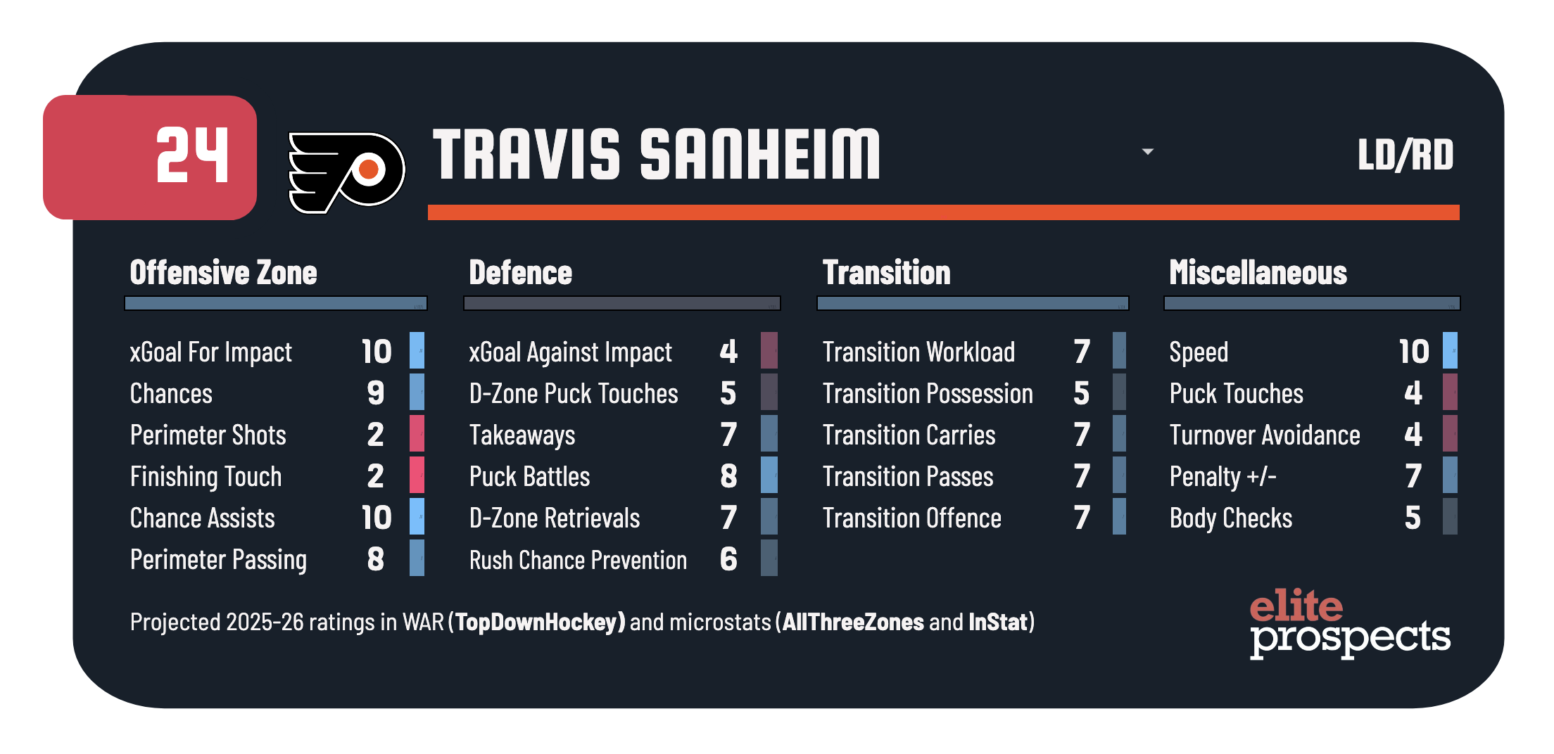 When Hockey Canada picked the depth defencemen for their 4 Nations roster, they were looking for two qualities above all: size, and mobility. It's no surprise, then, that they took Travis Sanheim, who exemplifies those characteristics as well as anybody in the game. Between his massive reach and elite speed, he can cover an enormous amount of ground in no time, which pays off defensively where he's an aggressive and effective one-on-one defender. He's taken his promotion to the Flyers' number one defenceman job as the green light to get involved in everything, taking every opportunity he's presented whether it's crashing for rebounds, pinching to the half-wall, skating the puck around the net, even screening the goalie from time to time. His puck-moving in transition is shakier than his puck-carrying and he still has chip-off-the-glass habits, but if he could play every position on the ice he would. His adventures often leave his linemates covering for him and he could stand to cool it on the turnovers, but if he maintains his 2024-25 form next year he'll grade quite a bit higher.