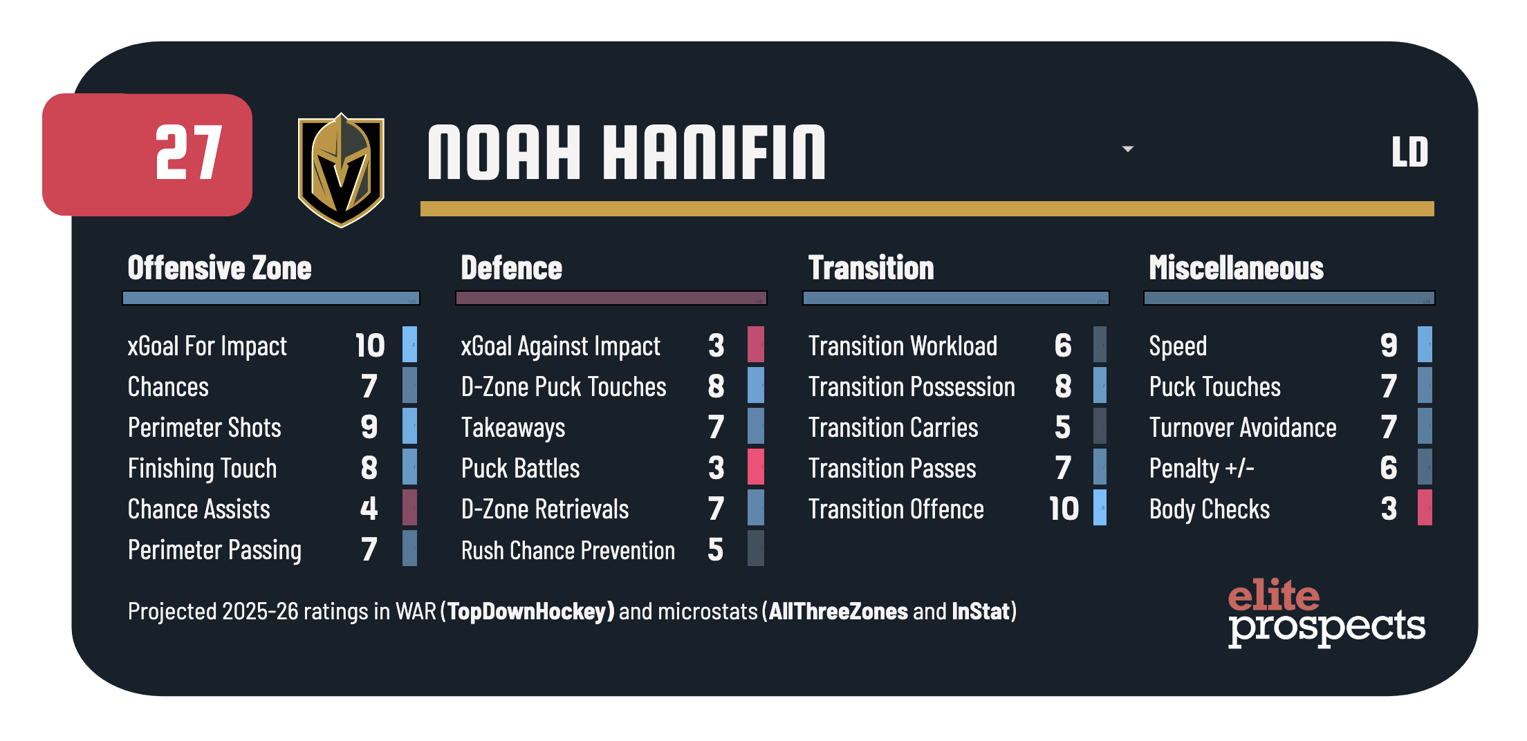 Noah Hanifin will have to adjust to life without Pietrangelo as his primary partner from 2024-25 heads to the long-term injured list, and that likely means a heavier workload both in terms of minutes and time with the puck. Given his gifts as a skater and a puck-mover, we could be in for the most effective season of his career. Hanifin is a generous provider of rush scoring chances to the forwards he plays with, always keeping his feet moving and his head up to identify and exploit lanes through the neutral zone. He's not particularly physical for his size but does have an active defensive stick, wins races in his own end, and kills plays early off the rush, indicating that while his defensive results since 2023 have diminished there might be some possibility of redemption there.