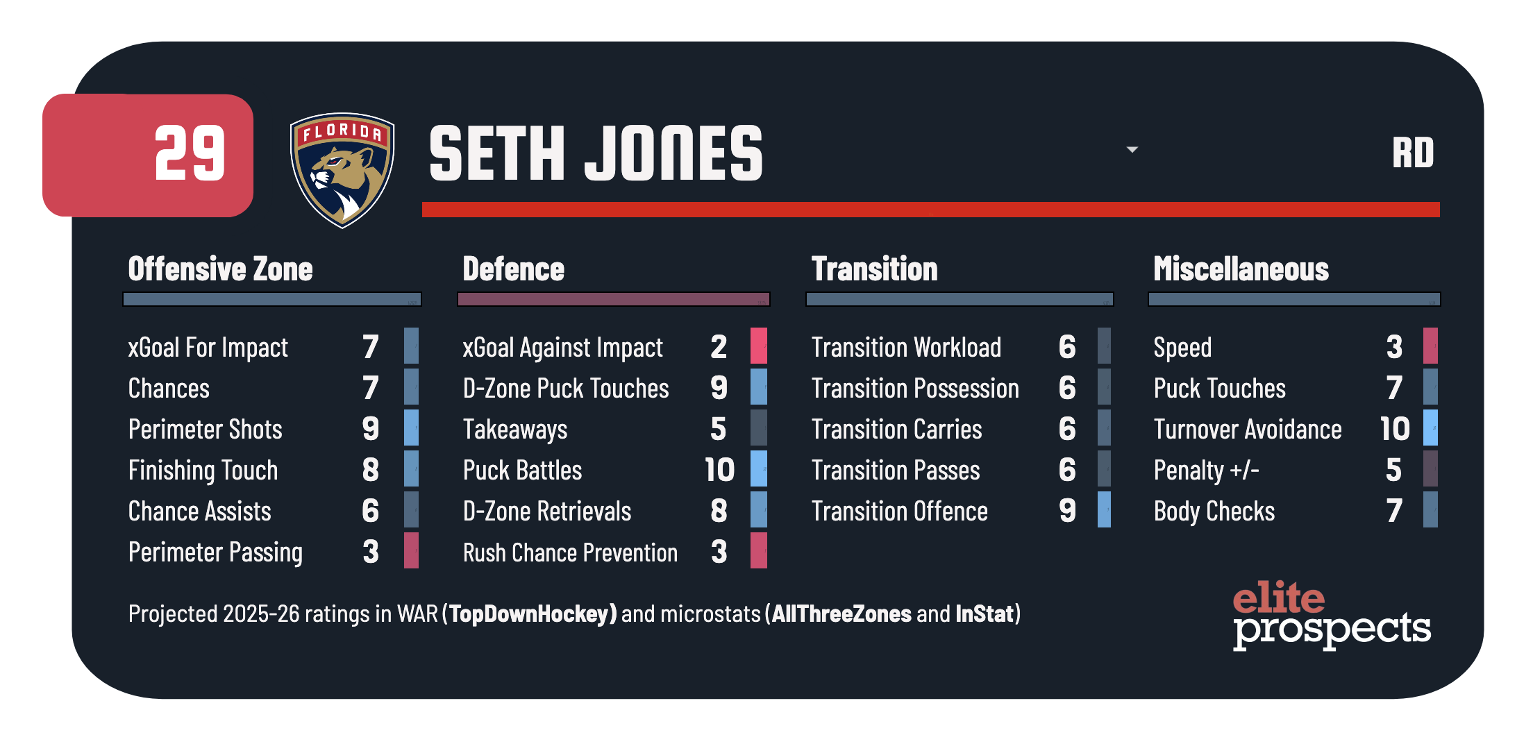 It must feel pretty good being Seth Jones at the moment. A few months ago, he was staring down several more years as the disrespected number one defenceman of a hopeless Blackhawks squad; now he's a vindicated Stanley Cup champion who was not only not a passenger but in fact led Florida in ice time. Jones' physical gifts and above-average ability in most areas of the game have almost always made him a capable if unexceptional minute-muncher, even in Chicago, and the key with him was always to avoid overpaying him and mitigate the weaknesses in his game, and that's exactly what the Panthers have done. Jones' solid in-zone offensive ability, strong puck protection, and physical presence in the defensive zone are well-suited to the way Florida plays, and his Achilles' heel of defending speed off the rush is well-insulated in their high-pressure defensive structure. Franchise number one is beyond his reach (and always was), but effective big-minute player is a role for which he's well-suited.